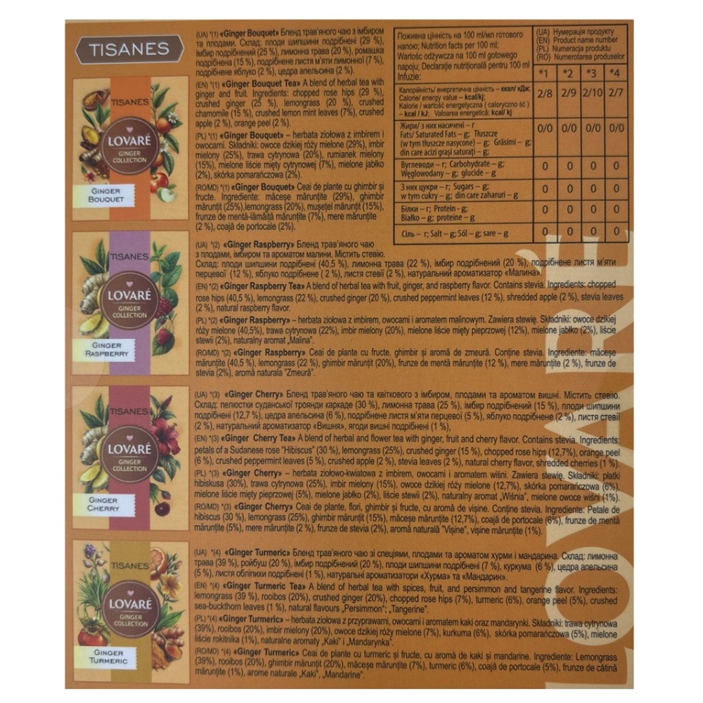 | Componenta | GINGER BOUQUET | GINGER RASPBERRY | GINGER TURMERIC | GINGER CHERRY |