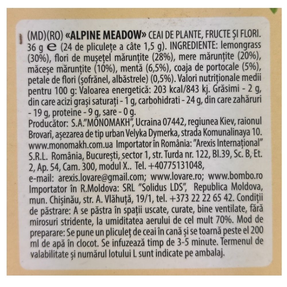 Lemongrass (30%), flori de musetel maruntite (28%), mere maruntite (20%), macese maruntite (10%), menta (6,5%), coaja de portocale (5%), petale de flori (sofranel, albastrele) (0,5%).