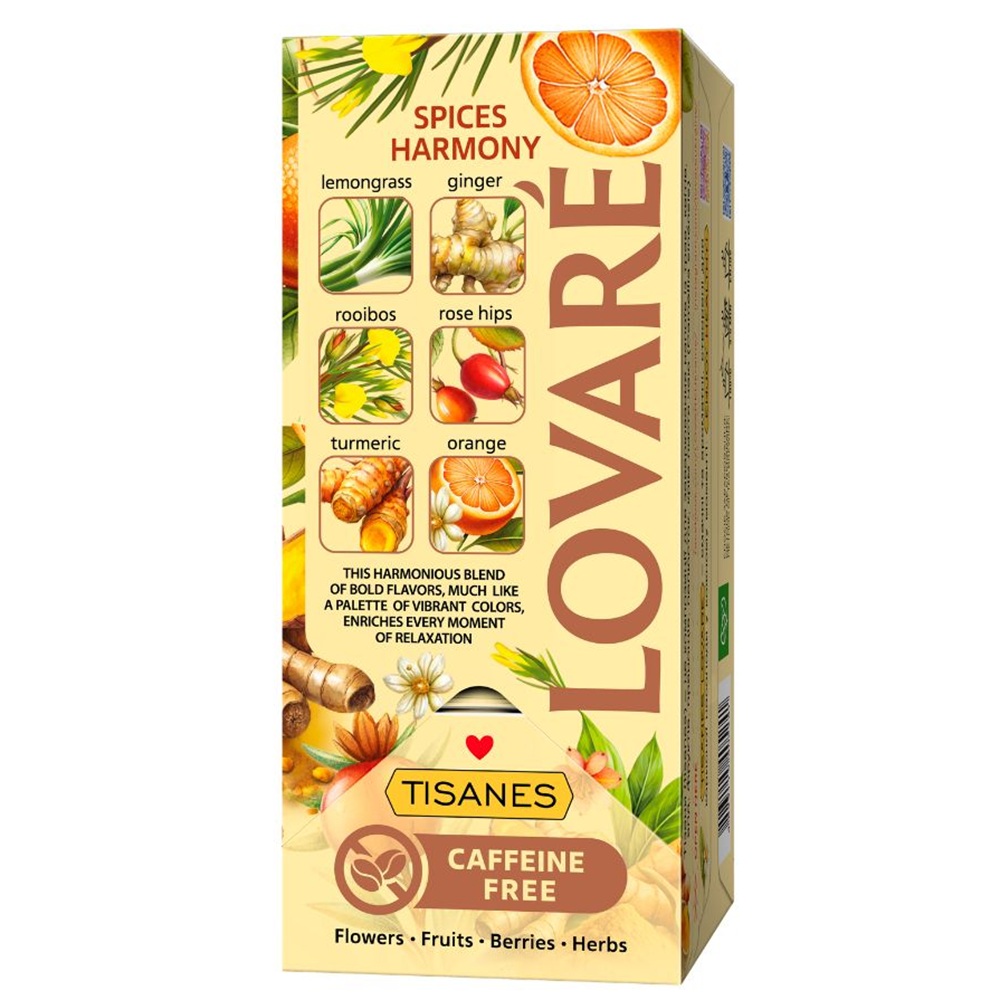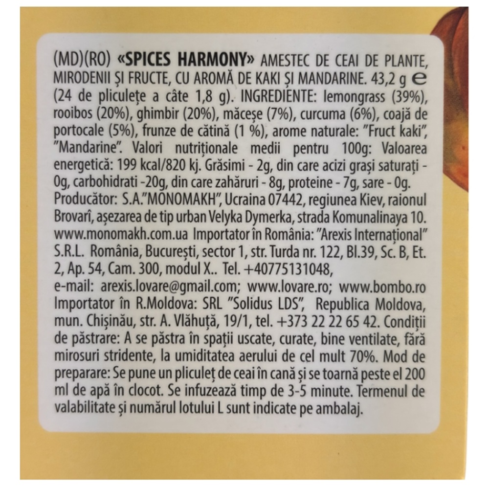 Lemongrass (39%), rooibos (20%), ghimbir (20%), macese (7%), curcuma (6%), coaja de portocale (5%), frunze de catina (1%), arome naturale: fruct kaki, mandarine.