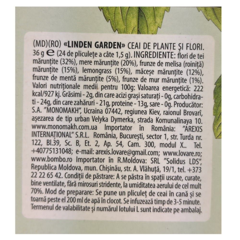- amestec de frunze de tei, mere, melisa, lemongrass, macese, menta si frunze de mur;