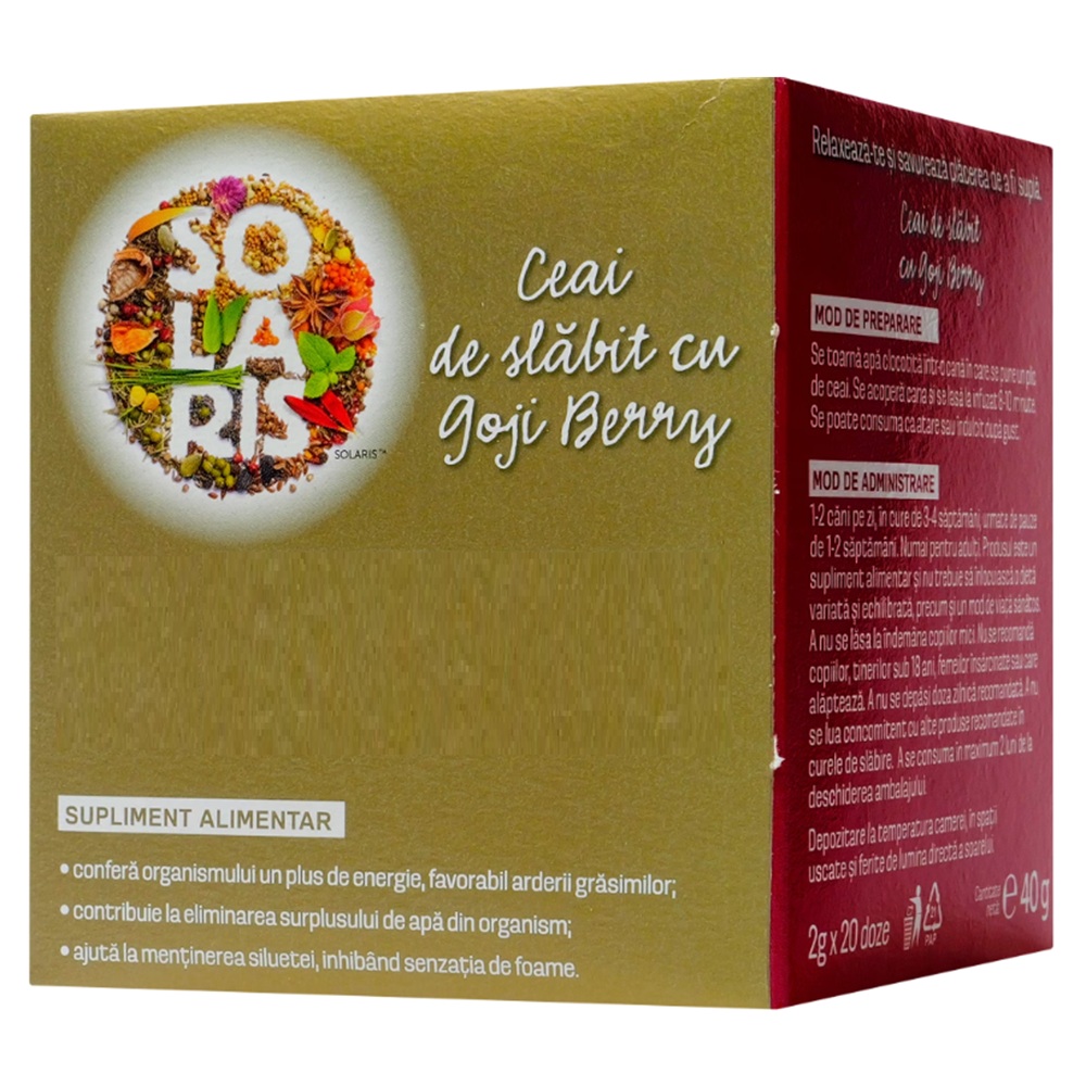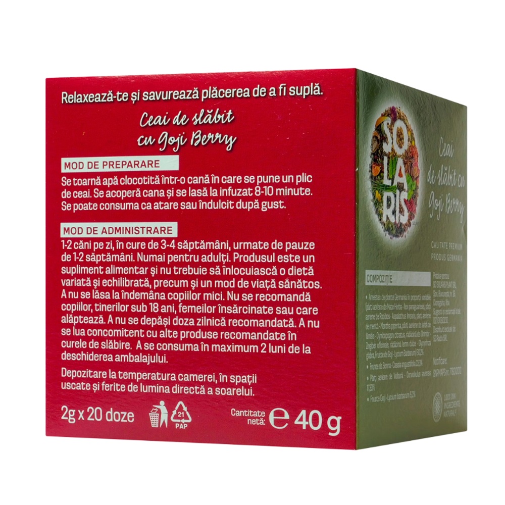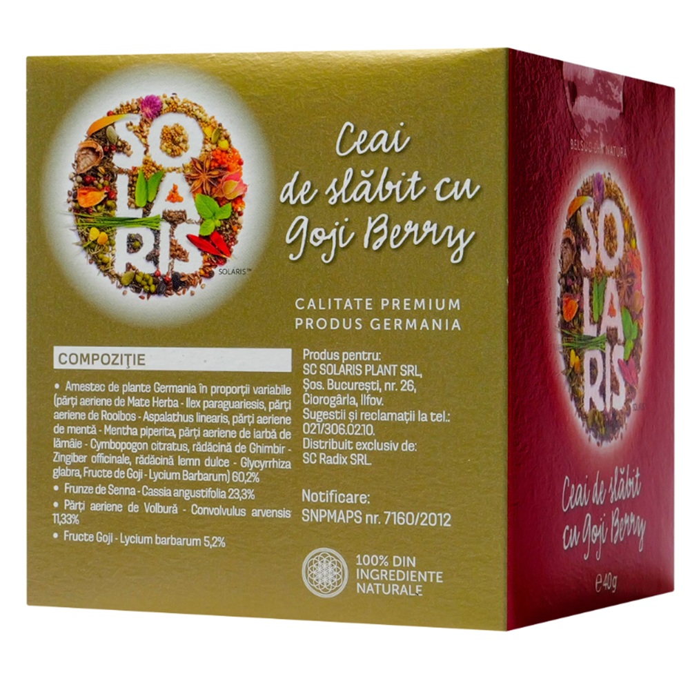 Amestec de plante Germania in proportii variabile (parti aeriene de Mate Herba - Ilex paraguariensis, parti aeriene de Rooibos - Aspalathus linearis, parti aeriene de menta - Mentha piperita, parti aeriene de iarba de lamaie - Cymbopogon citratus, radacina de ghimbir - Zingiber officinale, radacina lemn dulce - Glycyrrhiza glabra, fructe de Goji - Lycium barbarum) 60,2%, frunze de Senna - Cassia angustifolia 23,3%, parti aeriene de Volbura - Convolvulus arvensis 11,33%, fructe Goji - Lycium barbarum 5,2%.