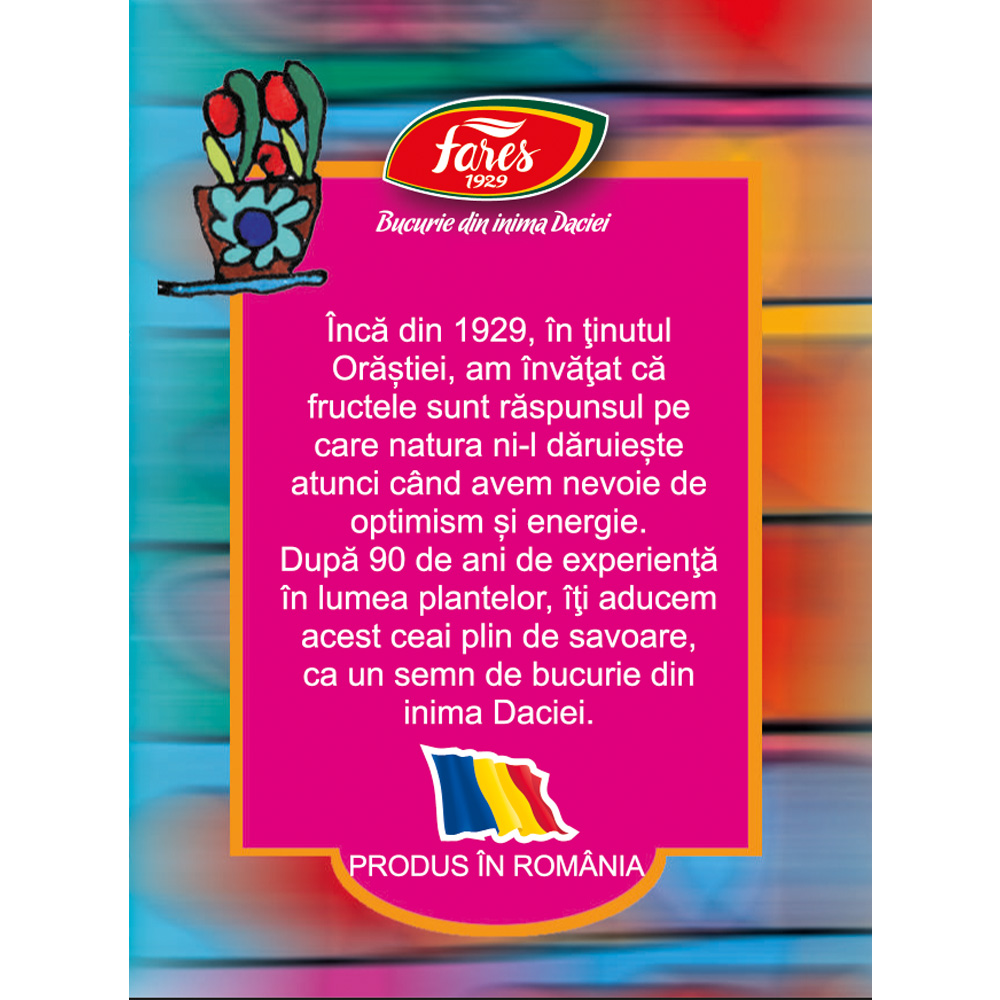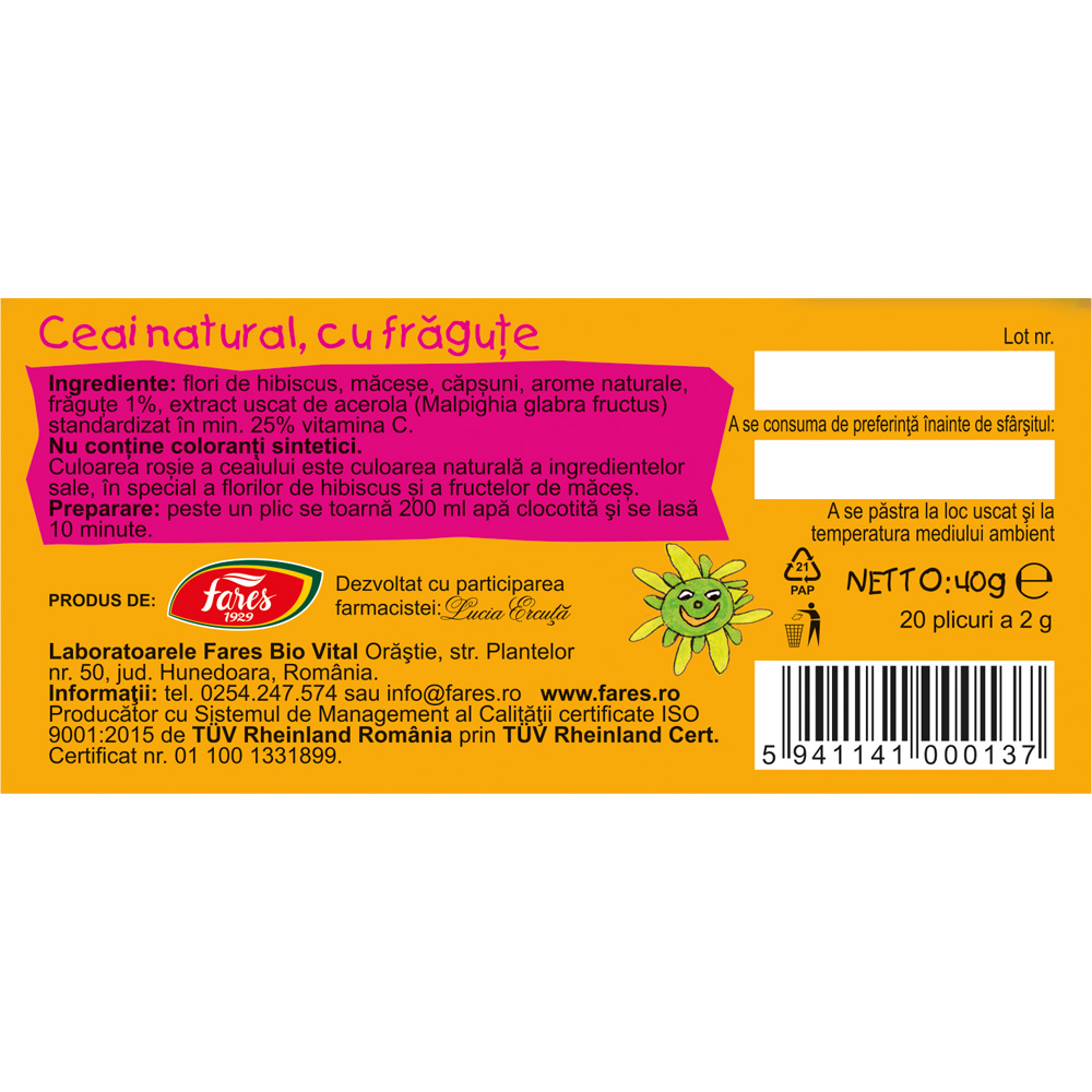 Ingrediente:Flori de hibiscus, măceșe, căpşuni, arome naturale, frăguțe 1%, extract uscat de acerola (Malpighia glabra fructus) standardizat în min. 25% vitamina C.