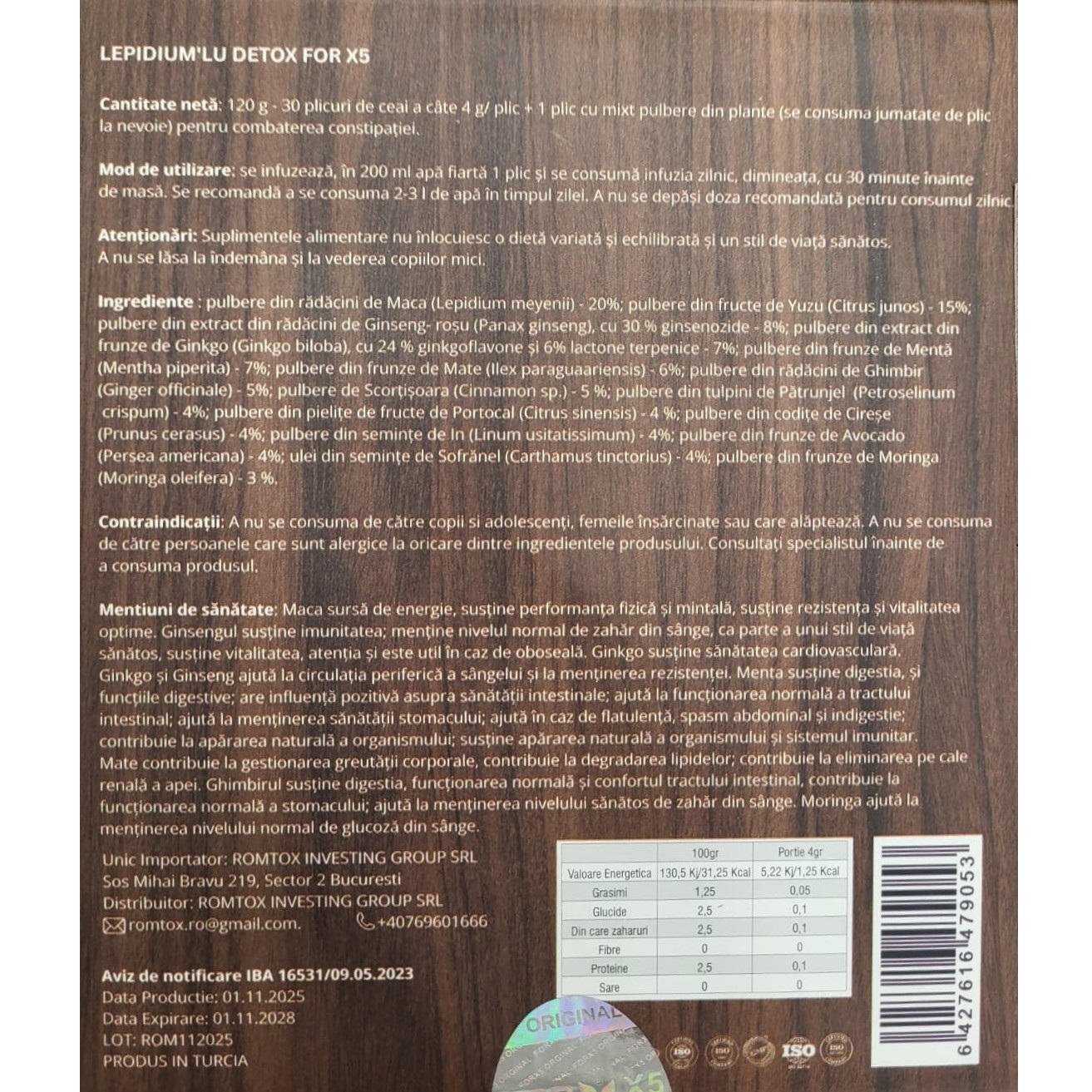 Pulbere din radacini de Maca (Lepidium meyenii) - 20%; pulbere din fructe de Yuzu (Citrus junos) - 15%; pulbere din extract din radacini de Ginseng- rosu (Panax ginseng), cu 30 % ginsenozide - 8%; pulbere din extract din frunze de Ginkgo (Ginkgo biloba), cu 24 % ginkgoflavone si 6% lactone terpenice - 7%; pulbere din frunze de Menta (Mentha piperita) - 7%; pulbere din frunze de Mate (Ilex paraguaariensis) - 6%; pulbere din radacini de Ghimbir (Ginger officinale) - 5%; pulbere de Scortisoara (Cinnamon sp.) - 5%; pulbere din tulpini de Patrunjel (Petroselinum crispum) - 4%; pulbere din pielite de fructe de Portocal (Citrus sinensis) - 4 %; pulbere din codite de Cirese (Prunus cerasus) - 4%; pulbere din seminte de In (Linum usitatissimum) - 4%; pulbere din frunze de Avocado (Persea americana) - 4%; ulei din seminte de Sofranel (Carthamus tinctorius) - 4%; pulbere din frunze de Moringa (Moringa oleifera) - 3 %.