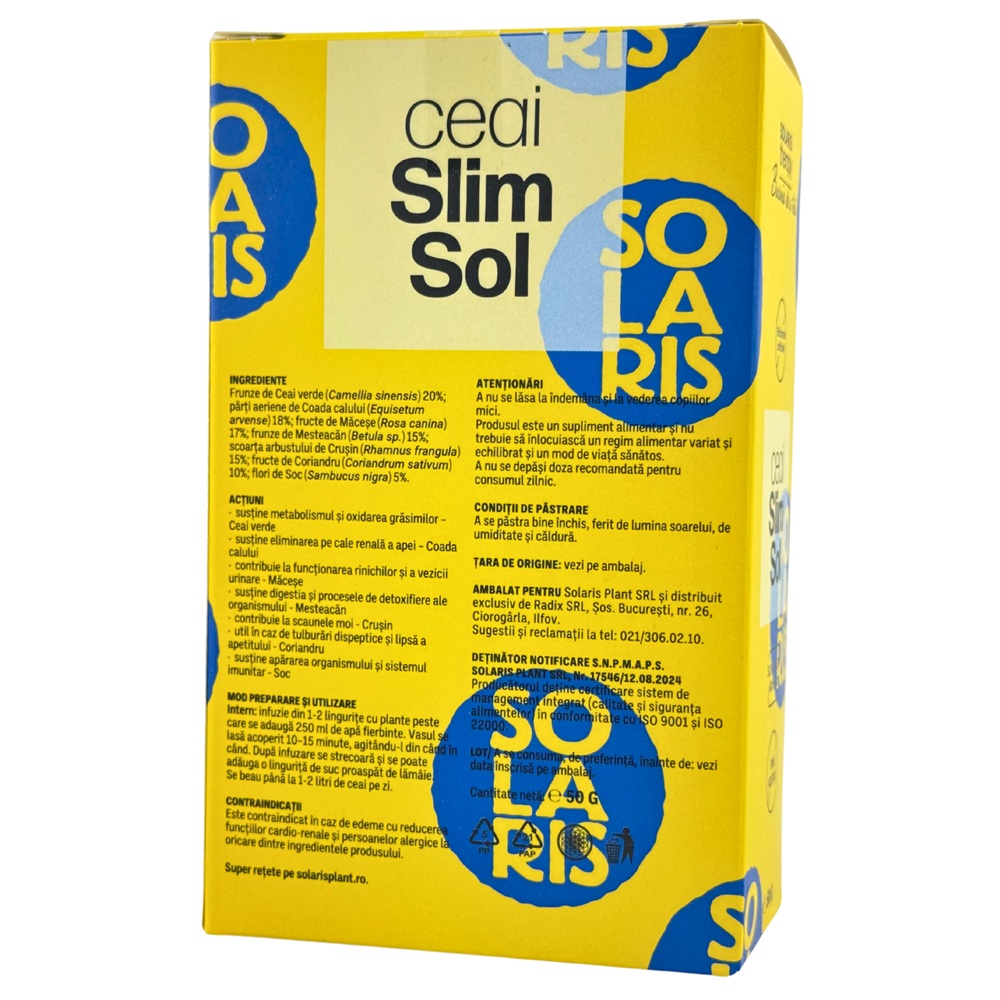 Ingrediente:Frunze de Ceai-verde (Camellia sinensis) – 20%; parti aeriene de Coada-calului (Equisetum arvense) – 18%; fructe de Macese (Rosa canina) – 17%; frunze de Mesteacan (Betula sp.) – 15%; scoarta arbustului de Crusin (Rhamnus frangula) – 15%; fructe de Coriandru (Coriandrum sativum) – 10%; flori de Soc (Sambucus nigra) – 5%