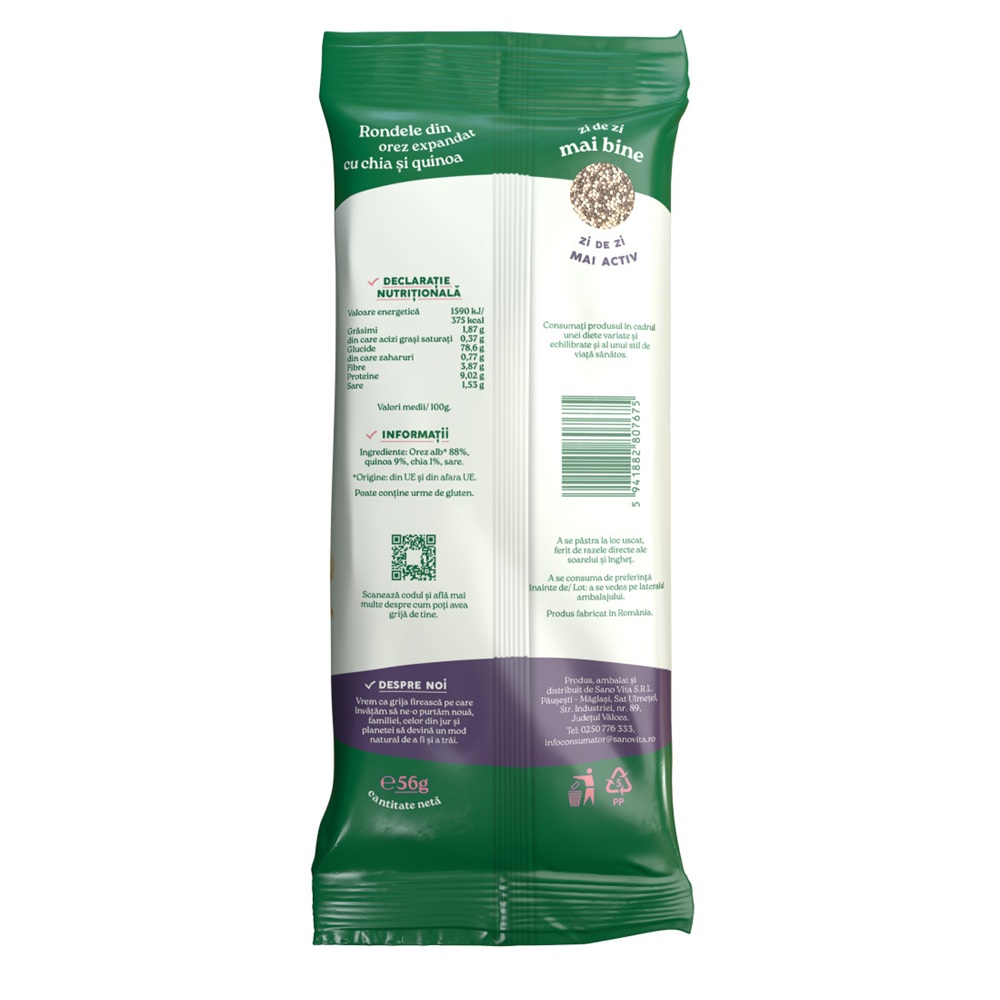 Orez alb* 88.5%, quinoa 9%, chia 1%, sare, lecitină din floarea soarelui