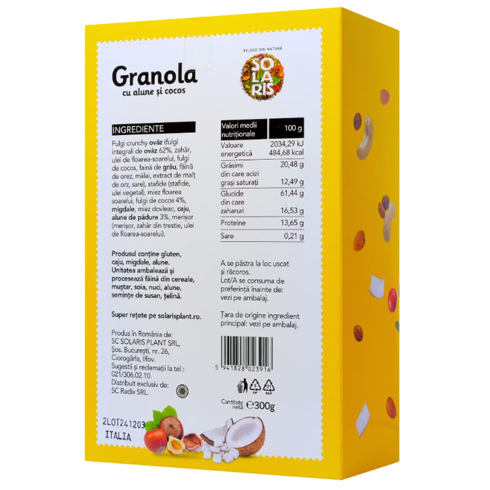 Fulgi crunchy ovaz (fulgi integrali de ovaz (62%), zahar, ulei de floarea-soarelui, fulgi de cocos, faina de grau, faina de orez, malai, extract de malt de orz, sare, stafide (stafide, ulei vegetal), miez floarea soarelui, fulgi de cocos 4%, migdale, miez dovleac, caju, alune de padure 3%, merisor (merisor, zahar din trestie, ulei de floarea-soarelui).