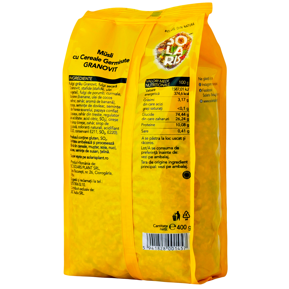 Ingrediente:Fulgi grau Granovit, fulgi secara Granovit, stafide ( stafide, ulei vegetal), fulgi de porumb, curmale, banane ( banane, ulei de cocos rafinat, zahar, aroma de banana), cocos, seminte de dovleac, seminte de floarea soarelui, papaya confiat (papaya, zahar din trestie, regulator de aciditate: acid citric, SO2), cirese in sirop (cirese, zahar, sirop de glucoza, coloranti naturali, acidifiant E330, conservant E211,SO2, E220).