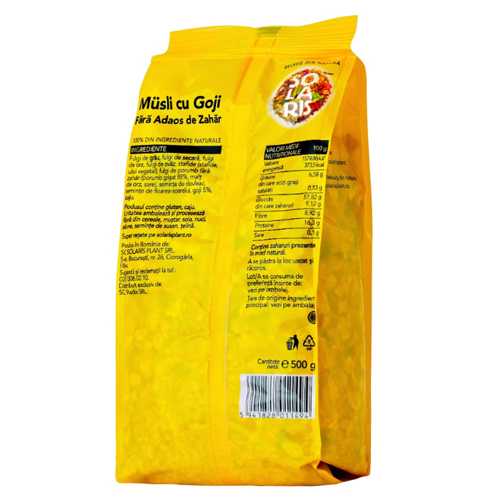 Ingrediente:Fulgi de cereale si fulgi de porumb fara zahar, stafide, seminte de dovleac, seminte de floarea soarelui, goji si caju.
