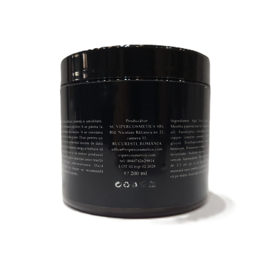 Ingrediente:Apă,Vitis vinifera leaf extract, Mentha piperita leaf oil, Cupressus sempervirens oil, Eucalyptus citriodora oil, Chlorophyllin copper complex powder, Glycerin, Propylene gycol, Triethanolamine, Carbopol, Sodium benzoate, Potassium sorbate, Citric acid, Sodium levulinate, Sodium anisate, Lactic acid, Viper venom ammodytes.