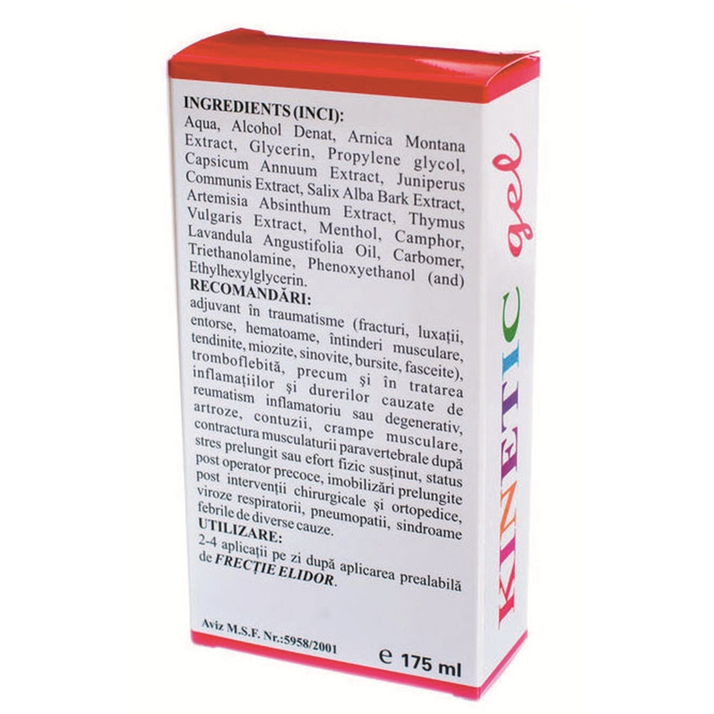 Ingrediente:Aqua, Alcohol Denat, Arnica Montana Extract, Glycerin, Propylene Glycol, Capsicum Annuum Extract, Juniperus Communis Extract, Salix Alba Bark Extract, Artemisia Absinthum Extract, Thymus Vulgaris Extract, Menthol, Camphor, Lavandula Angustifolia Oil, Carbomer, Triethanolamine, Phenoxyethanol (and) Ethylhexylglycerin.