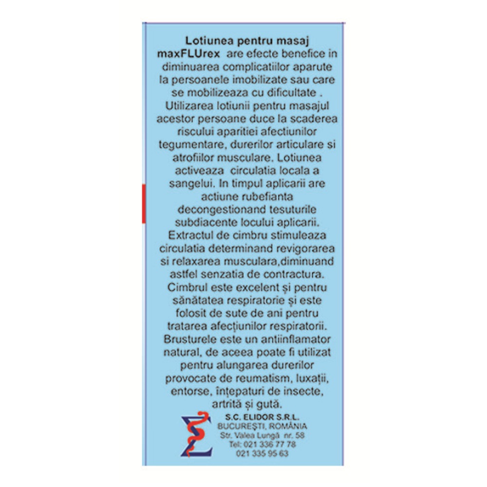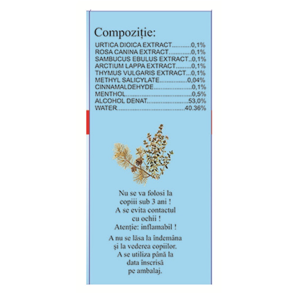 Ingrediente:Urtica Dioica Extract 0,1%, Rosa Canina Extract 0,1%, Sambucus Ebulus Extract 0,1%, Arctium Lappa Extract 0,1%, Thymus Vulgaris Extract 0,1%, Methyl Salicylate 0,04%, Cinnamaldehyde 0,1%, Menthol 0,5%, Alcohol Denat. 53,0%, Water 40,36%.