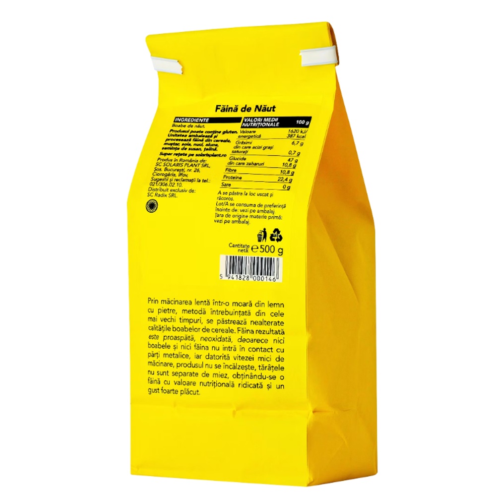 - obtinuta 100% prin macinarea lenta a boabelor de naut, in moara traditionala din lemn cu pietre;