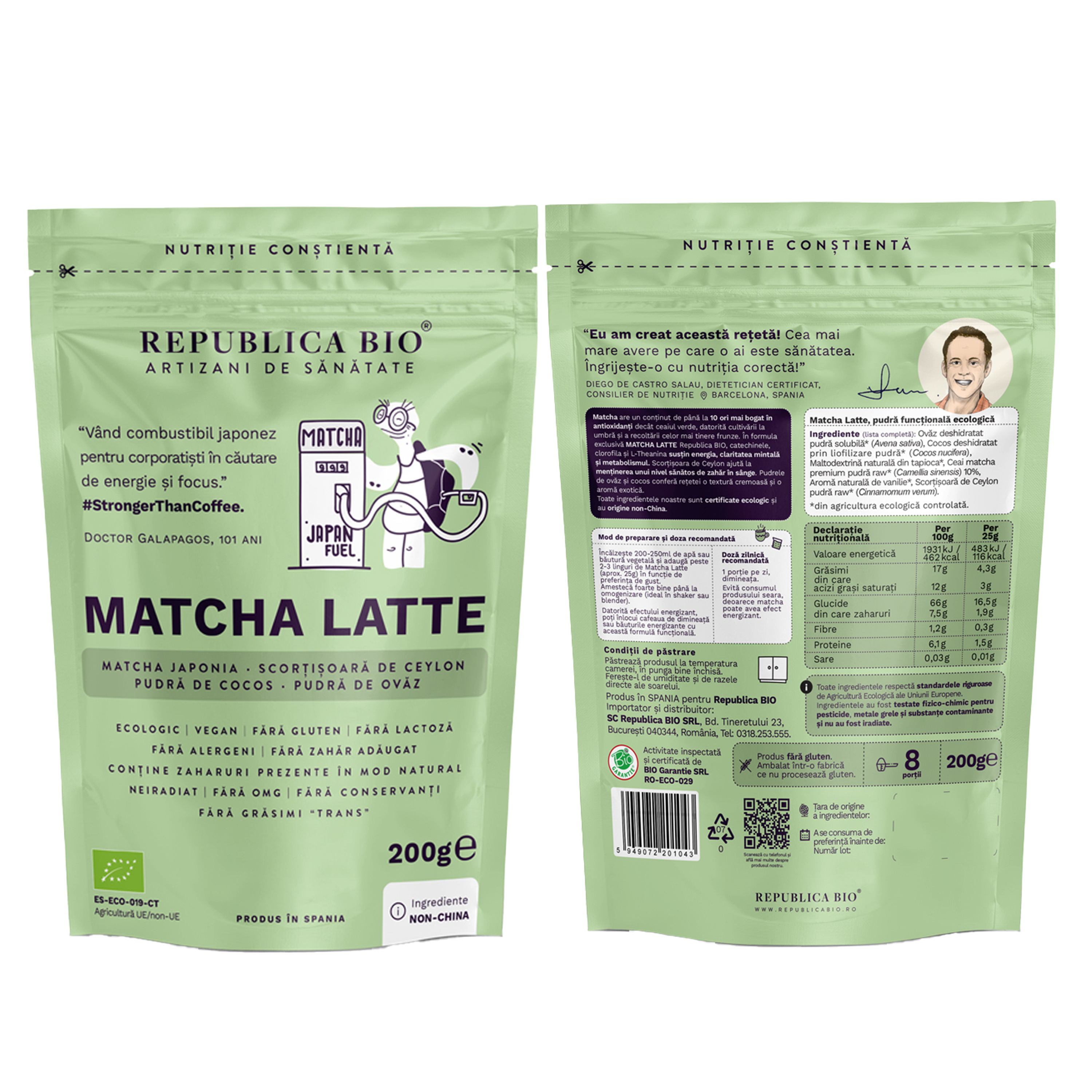 Ingrediente:Ovaz deshidratat pudra solubila* (Avena sativa), Cocos deshidratat prin liofilizare pudra* (Cocos nucifera), Maltodextrina naturala din tapioca*, Ceai matcha premium pudra raw* (Camellia sinensis), Aroma naturala de vanilie*, Scortisoara de Ceylon pudra raw* (Cinnamomum verum); *= din agricultura ecologica controlata.