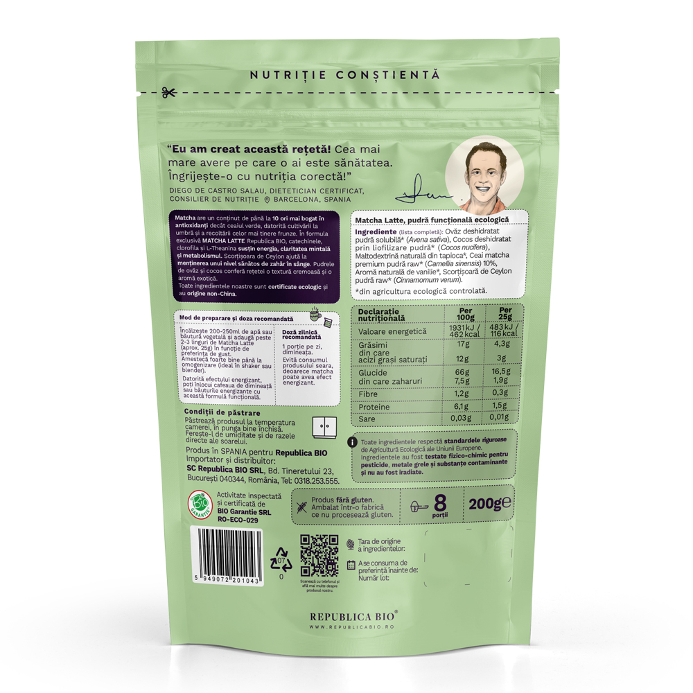 - in formula Matcha Latte Republica BIO, catechinele, clorofila si L-Theanina pot contribui la sustinerea energiei si a metabolismului;