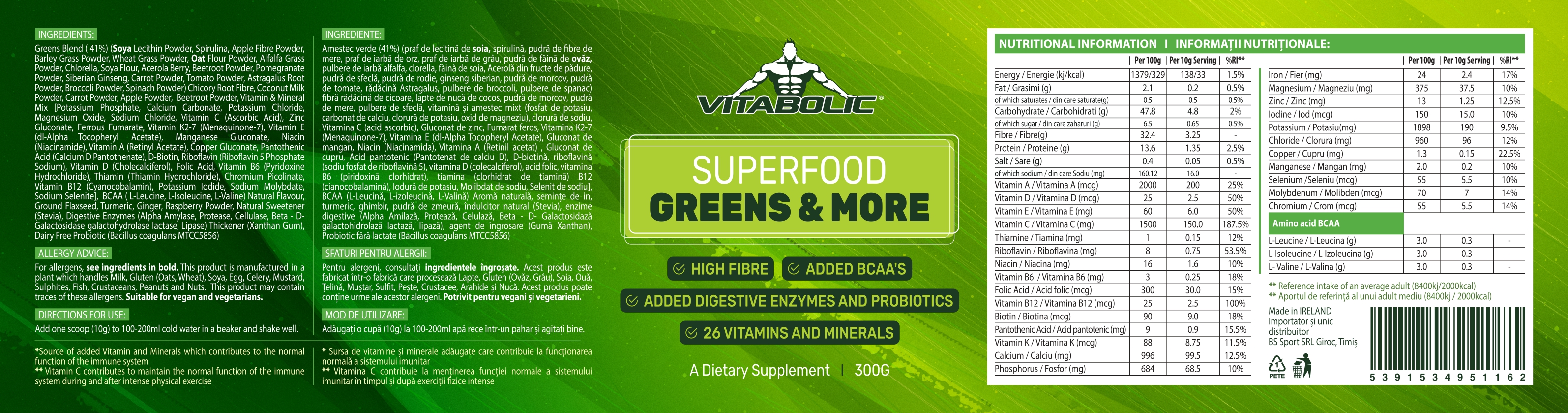 Ingrediente:Amestec verde : praf de lecitină de soia, spirulina, pudră de fibre de mere, praf de iarbă de orz, praf de iarbă de grâu, pudră de făină de ovăz, pulbere de iarbă alfalfa, clorella, făină de soia, acerola, pudră de sfeclă, pudră de rodie, ginseng siberian, Pudră de morcov, pudră de tomate, rădăcină Astragalus, pulbere de broccoli, pulbere de spanac. Fibră rădăcină de cicoare, lapte de nucă de cocos, pudră de morcov, pudră de mere, pulbere de sfeclă, vitamină și amestec mixt [fosfat de potasiu, carbonat de calciu, clorură de potasiu, oxid de magneziu, Clorură de sodiu, Vitamina C (acid ascorbic), Gluconat de zinc, Fumarat feros, Vitamina K2-7 (Menaquinone-7), Vitamina E (dl-Alpha Tocopheryl Acetate), Gluconat de mangan, Niacin (Niacinamida), Vitamina A (Retinil acetat) , Gluconat de cupru, Acid pantotenic (Pantotenat de calciu D), D-biotină, riboflavină (sodiu fosfat de riboflavină 5), vitamina D (colecalciferol), acid folic, vitamina B6 (piridoxină clorhidrat), tiamina (clorhidrat de tiamină) B12 (Cianocobalamină), Iodură de potasiu, Molibdat de sodiu, Selenit de sodiu], BCAA (L-Leucină, L-izoleucină, L-Valină) Aromă naturală, semințe de in, turmeric, ghimbir, pudră de zmeură, îndulcitor natural (Stevia), enzime digestive (Alpha Amilază, Protează, Celulază, Beta - D- Galactosidază galactohidrolază lactază, Glază Xanthan), Probiotic fără lactate (Bacillus coagulans MTCC5856).