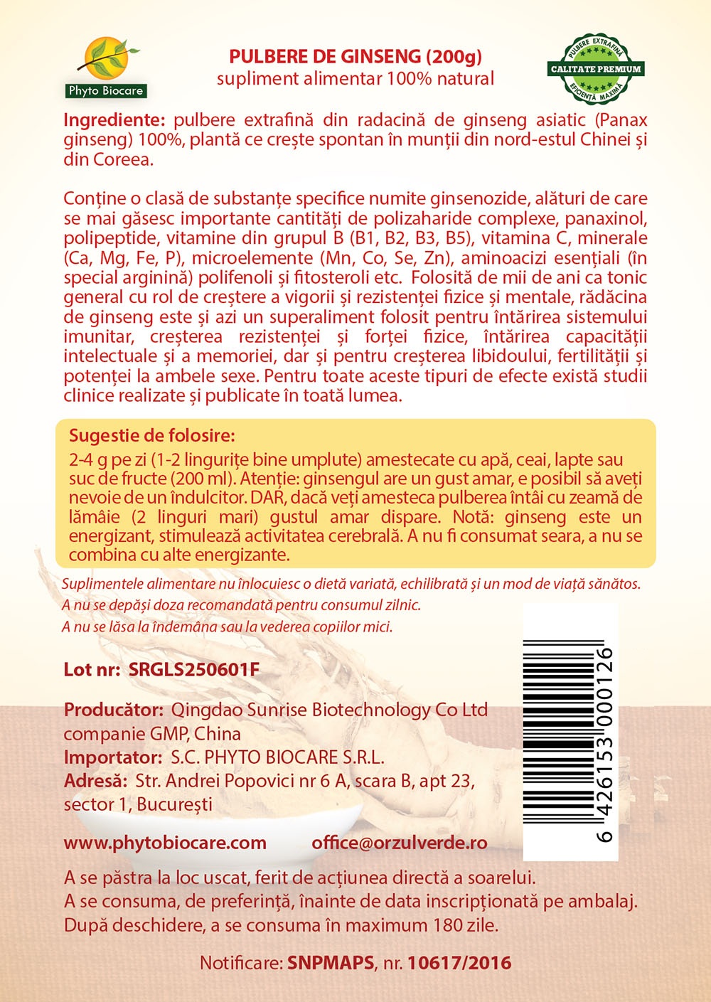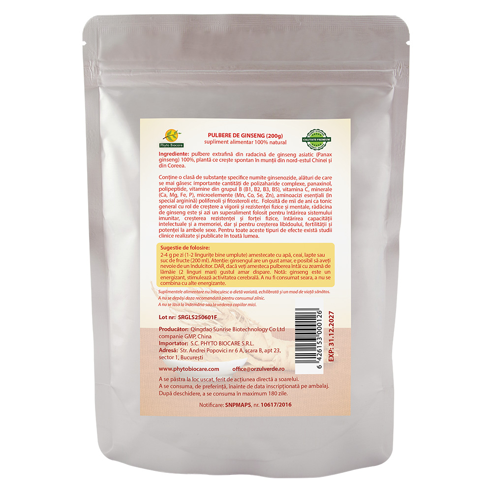 Ingrediente:Pulbere extrafina din radacina de ginseng asiatic (Panax ginseng) 100%, planta ce creste spontan in muntii din nord-estul Chinei si din Coreea.