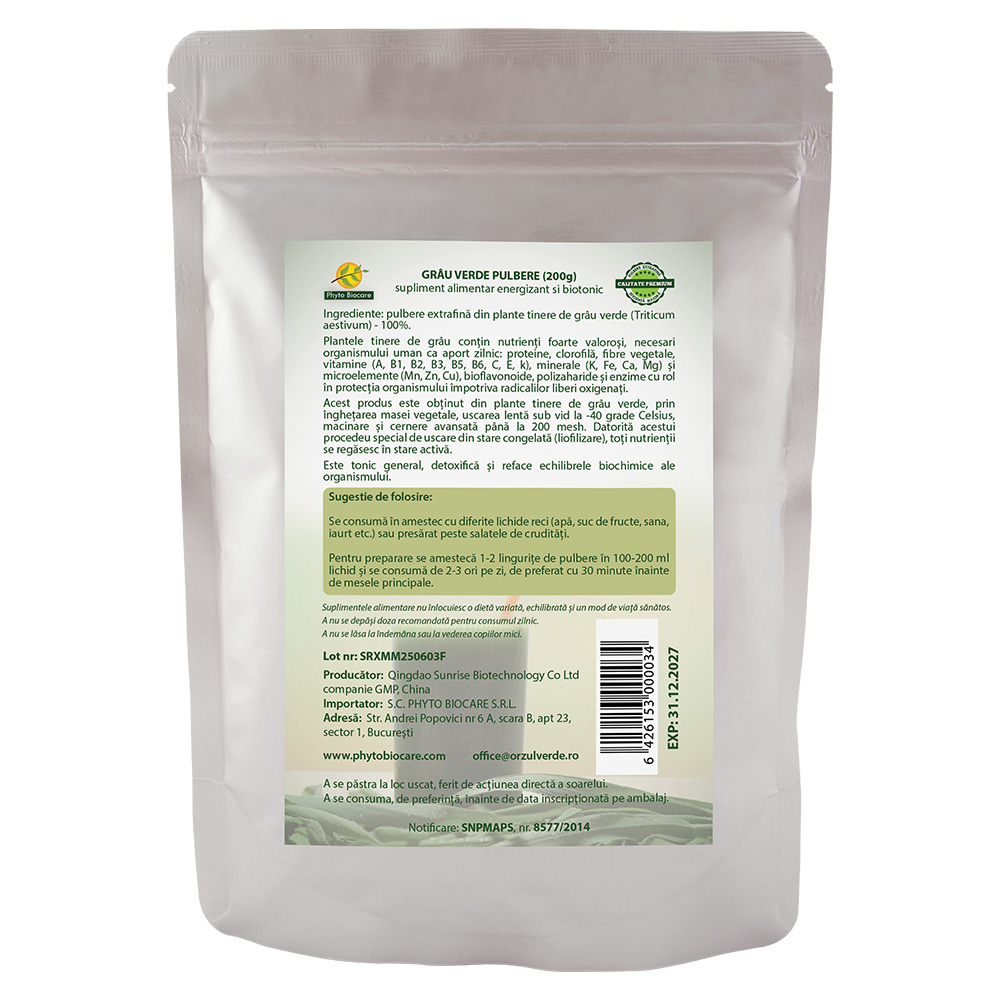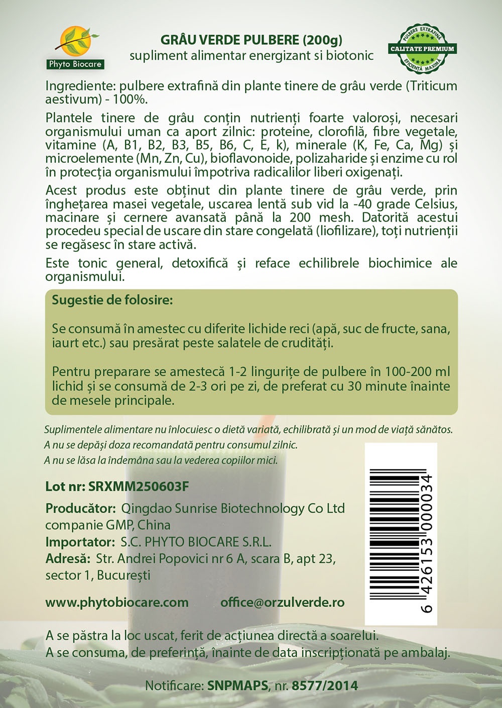 - acest produs este obtinut din plante tinere de grau verde, prin inghetarea masei vegetale, uscarea lenta sub vid la -40 grade Celsius, macinare si cernere avansata pana la 200 mesh;