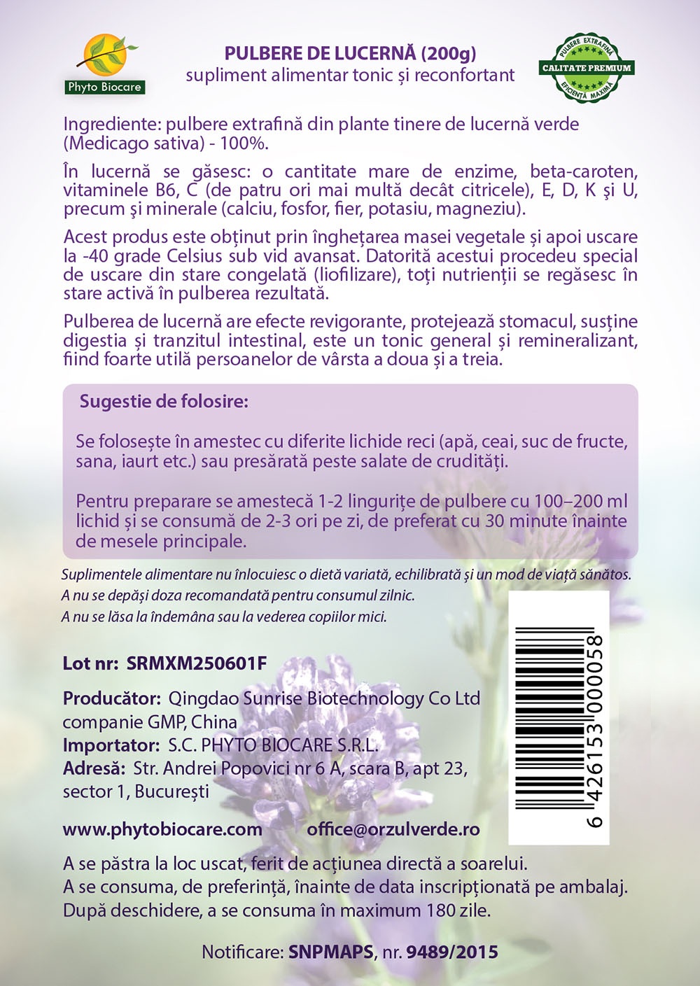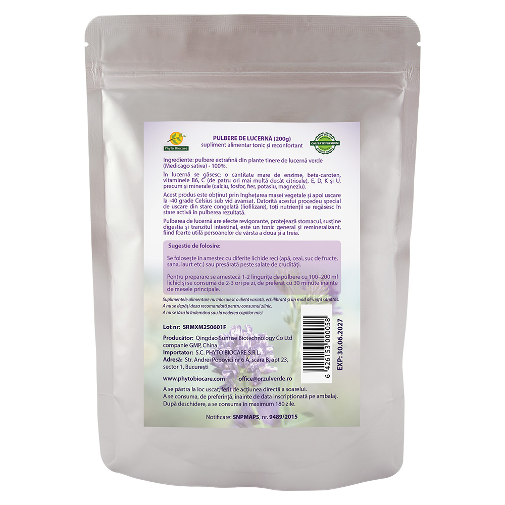Pulbere extrafina din plante tinere de lucerna verde (Medicago sativa) - 100%.