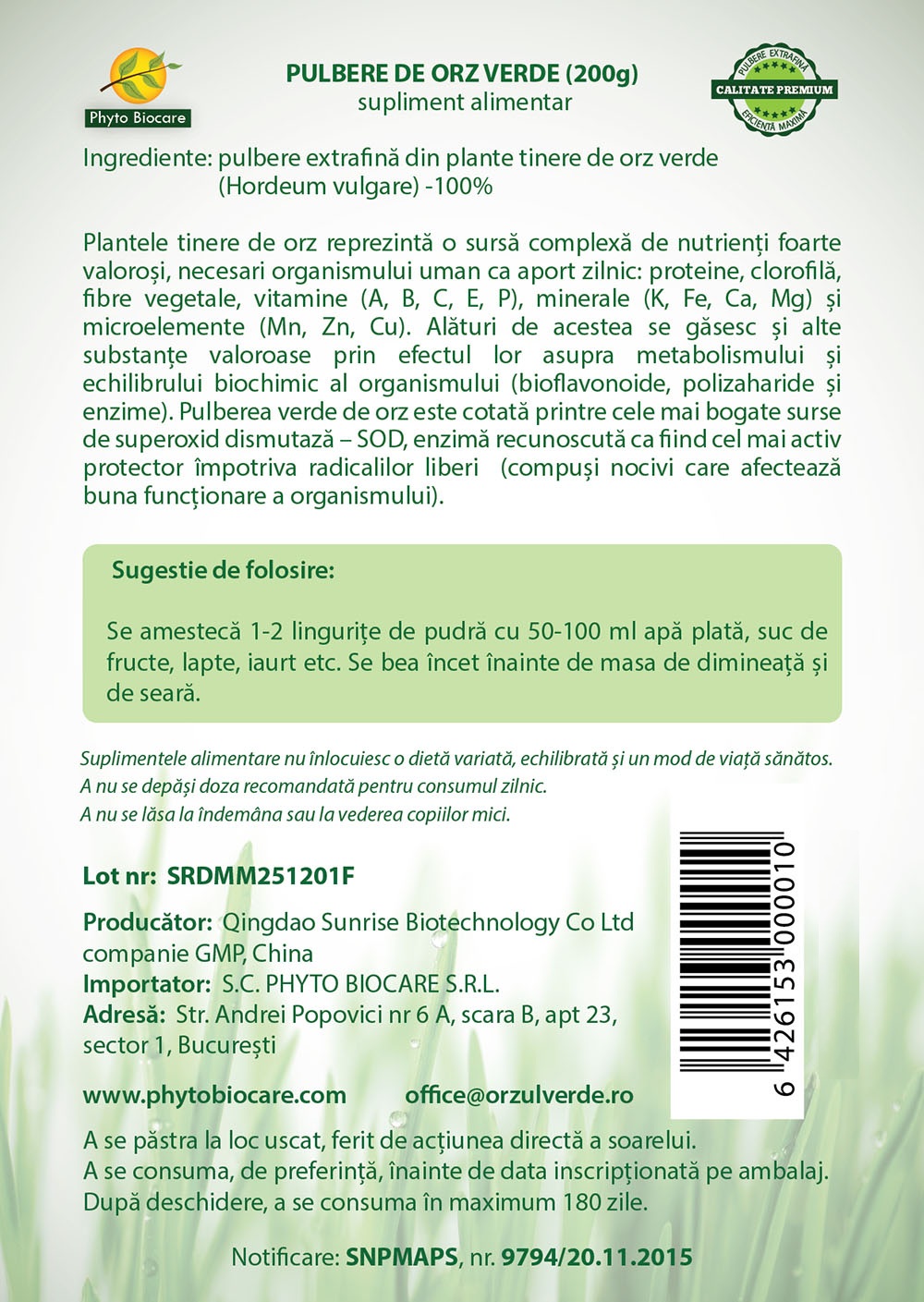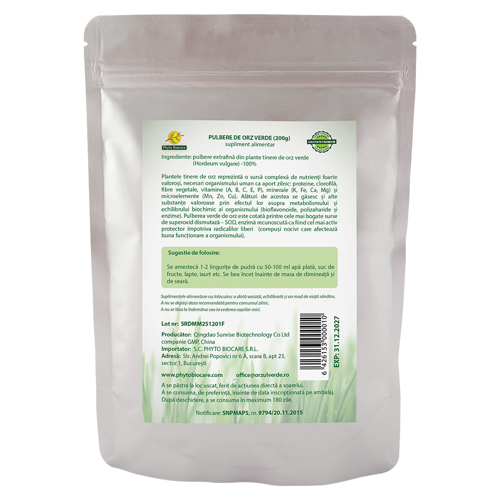 - pulberea verde de orz este cotata printre cele mai bogate surse de superoxid dismutaza -SOD, enzima recunoscuta ca fiind cel mai activ protector impotriva radicalilor liberi (compusi nocivi care afecteaza buna functionare a organismului).