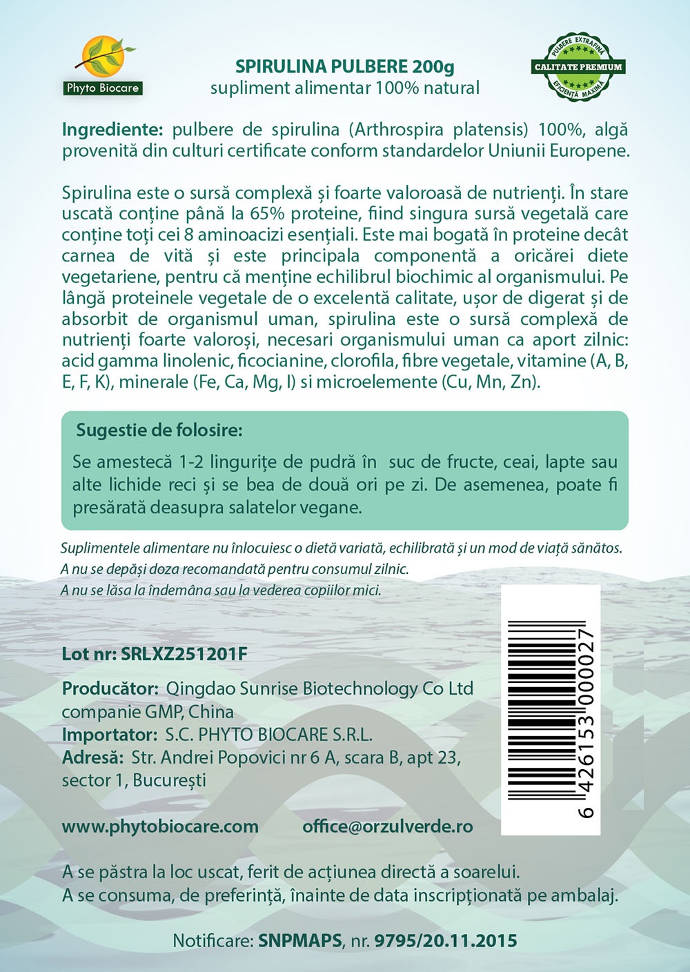 Farmacia Tei intelege importanta informatiilor prezentate in aceasta pagina si face eforturi permanente pentru a le pastra actualizate. Singura situatie in care informatiile prezentate despre Pulbere de spirulina, 200 g, Phyto Biocare pot fi diferite fata de cele prezentate pe site este aceea in care producatorul/importatorul aduce modificari specificatiilor/etichetei acestuia, fara a ne informa in prealabil. In cazul aparitiei unor diferente, prevaleaza informatia de pe etichetele produsului fizic.
