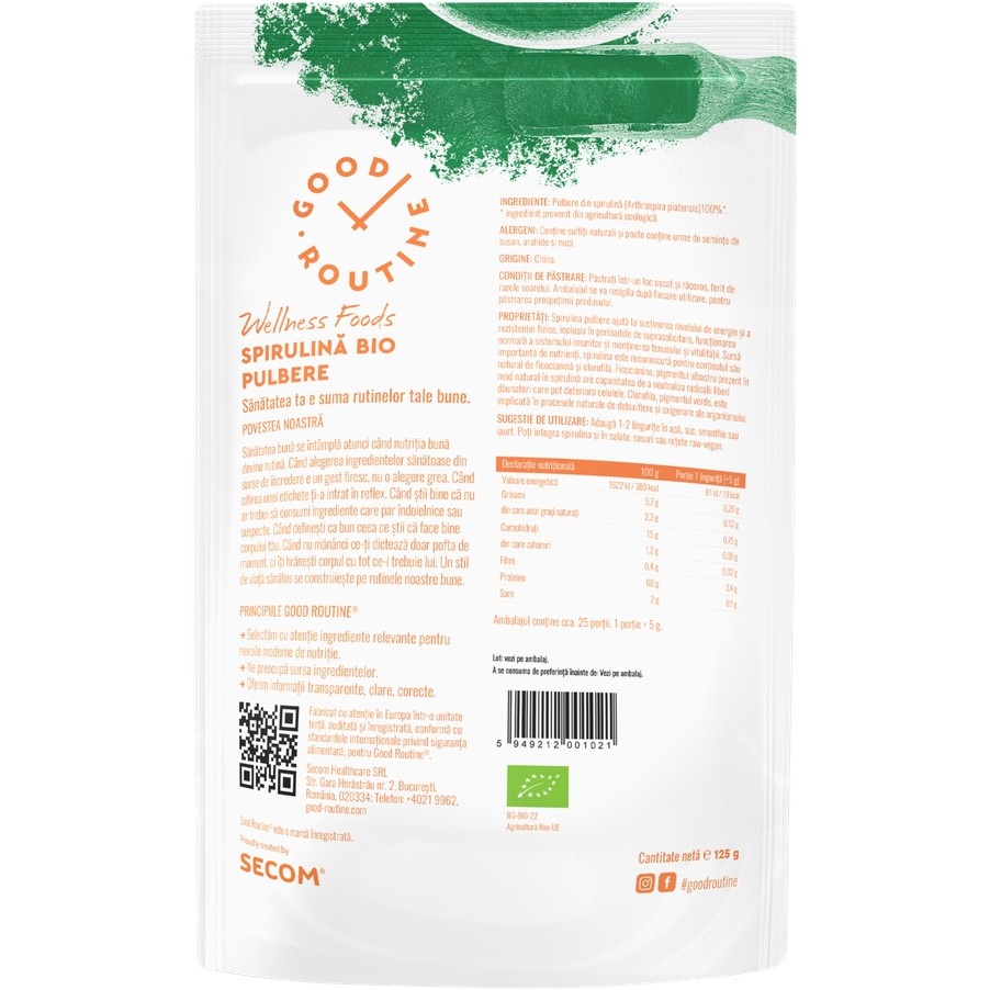 Pulbere de Spirulina Bio Good Routine, 125 g, Secom [5949212001021]