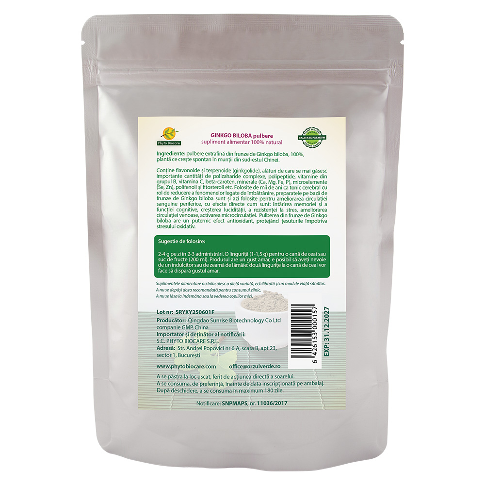 - pulberea din frunze de Ginkgo biloba poate avea proprietati antioxidante si poate contribui la protejarea tesuturilor impotriva stresului oxidativ.