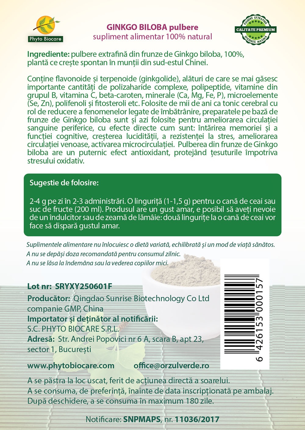 Ingrediente:Pulbere extrafina din frunze de Ginkgo biloba, 100%, planta ce creste spontan in muntii din sud-estul Chinei.