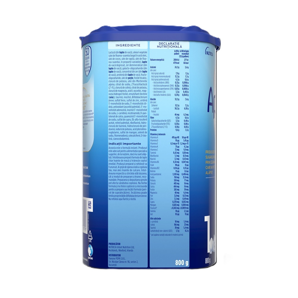 Lactoza (din lapte de vaca), uleiuri vegetale (ulei de floarea-soarelui bogat in acid oleic, ulei de cocos, ulei de rapita, ulei de floarea-soarelui), lapte de vaca degresat, zer demineralizat (din lapte de vaca), galactooligozaharide (din lapte de vaca), concentrat din zer (din lapte de vaca), proteina din lapte de vaca, fructooligozaharide, ulei de peste, fosfat tricalcic, clorura de potasiu, ulei din Mortierella alpina, citrat de sodiu, 2'Fucozillactoza (2'-FL), clorura de colina, citrat de potasiu, clorura de magneziu, acid L-ascorbic, magneziu hidrogen fosfat, emulsifiant (lecitine (soia)), taurina, inozitol, Bifidobacterium breve, sulfat feros, sulfat de zinc, uridina 5'-monofosfat de sodiu, 5'-monofosfat citidina, antioxidant (ascorbil palmitat), 5'-monofosfat adenozina, inozina 5'-monofosfat de sodiu, L-carnitina, nicotinamida, D-pantotenat de calciu, guanozina 5'-monofosfat de sodiu, sulfat de cupru, DL-alfa-tocoferil acetat, retinil palmitat, riboflavina, hidroclorura de tiamina, hidroclorura de piridoxina, iodurade potasiu, acid pteroilmonoglutamic, sulfat de mangan, selenit de sodiu, fitomenadiona, colecalciferol, D-biotina, cianocobalamina.