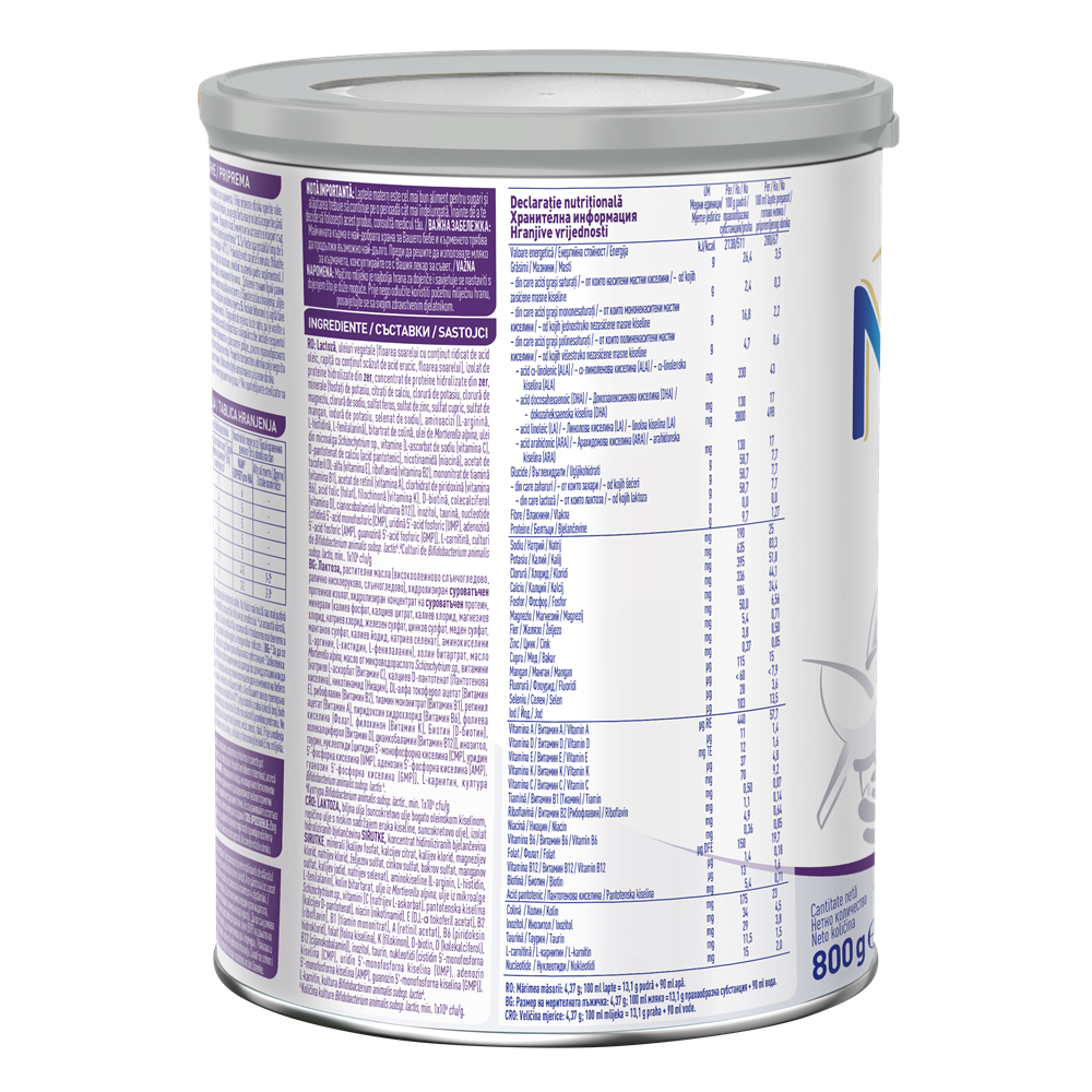 Lactoza, uleiuri vegetale (floarea soarelui cu continut ridicat de acid oleic, rapita cu continut scazut de acid erucic, floarea soarelui), izolat de proteine hidrolizate din zer, concentrat de proteine hidrolizate din zer, minerale (fosfati de potasiu, citrati de calciu, clorura de potasiu, clorura de magneziu, clorura de sodiu, sulfat feros, sulfat de zinc, sulfat cupric, sulfat de mangan, iodura de potasiu, selenat de sodiu), aminoacizi (L-arginina, L-histidina, L-fenilalanina), bitartrat de colina, ulei de Mortierella alpina, ulei din microalga Schizochytrium sp., vitamine [L-ascorbat de sodiu (vitamina C), D-pantotenat de calciu (acid pantotenic), nicotinamida (niacina), acetat de tocoferil DL-alfa (vitamina E), riboflavina [vitamina B2), mononitrat de tiamina (vitamina B1), acetat de retinil (vitamina A), clorhidrat de piridoxina (vitamina B6), acid folic (folat), filochinona (vitamina K), D-biotina, colecalciferol (vitamina D), cianocobalamina (vitamina B12)], inozitol, taurina, nucleotide [citidina 5'-acid monofosforic (CMP), uridina 5'-acid fosforic (UMP), adenozina 5'-acid fosforic (AMP), guanozina 5'-acid fosforic (GMP)], L-carnitina, culturi de Bifidobacterium animalis subsp. lactis.6**Culturi de Bifidobacterium animalis subsp. lactis, min. 1x106 cfu/g.