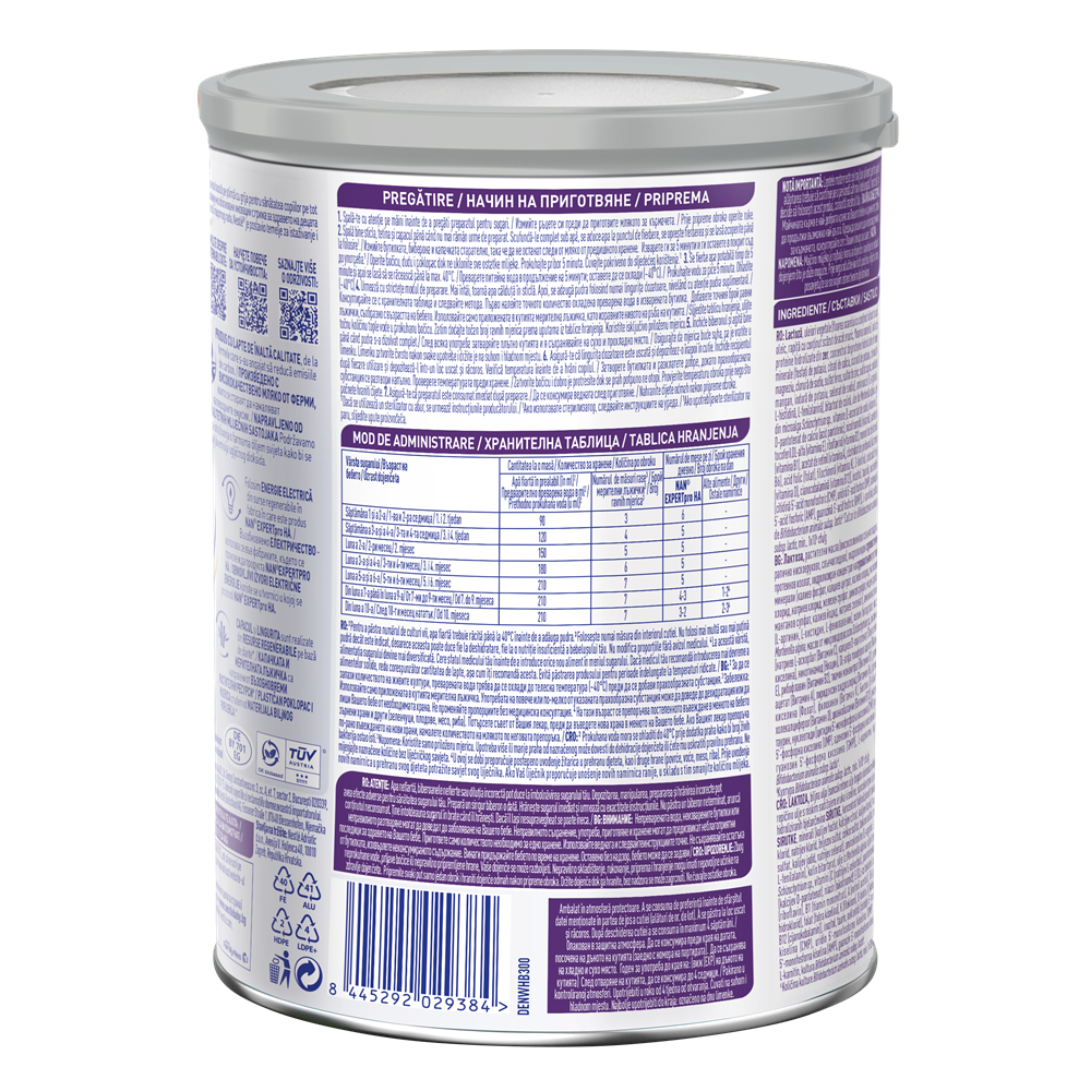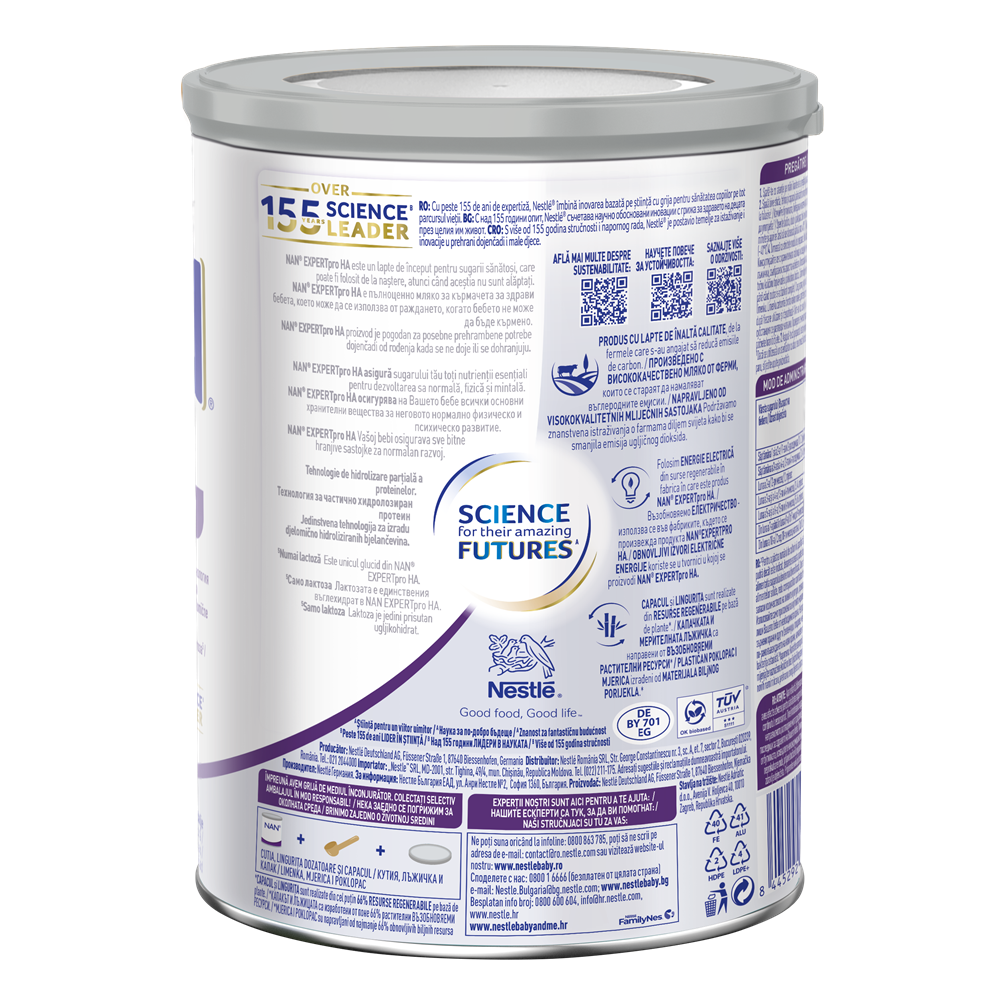 - contine o tehnologie de hidrolizare partiala a proteinelor, iar singurul glucid din NAN EXPERTpro HA este lactoza.