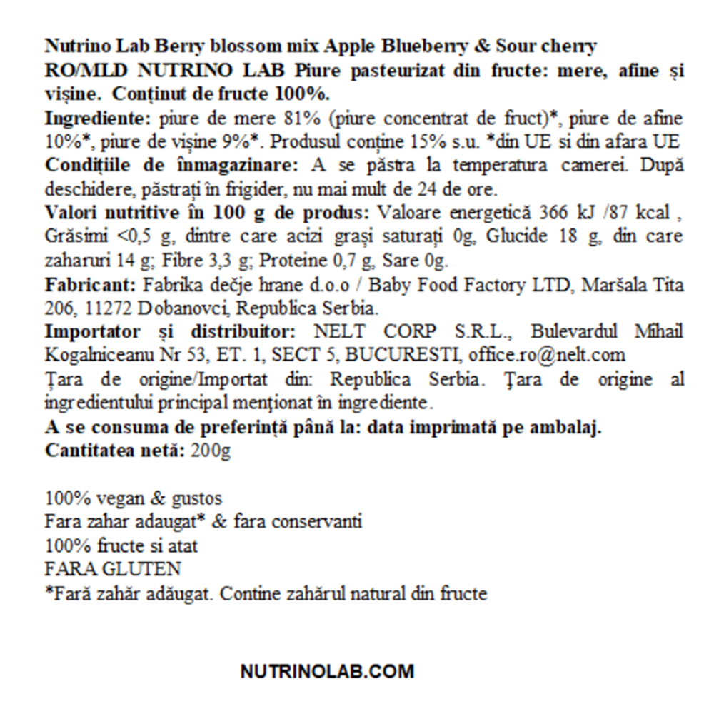 Ingrediente:Piure de mere 81% (din piure concentrat de fruct), Piure de afine 10%, Piure de visine 9%.