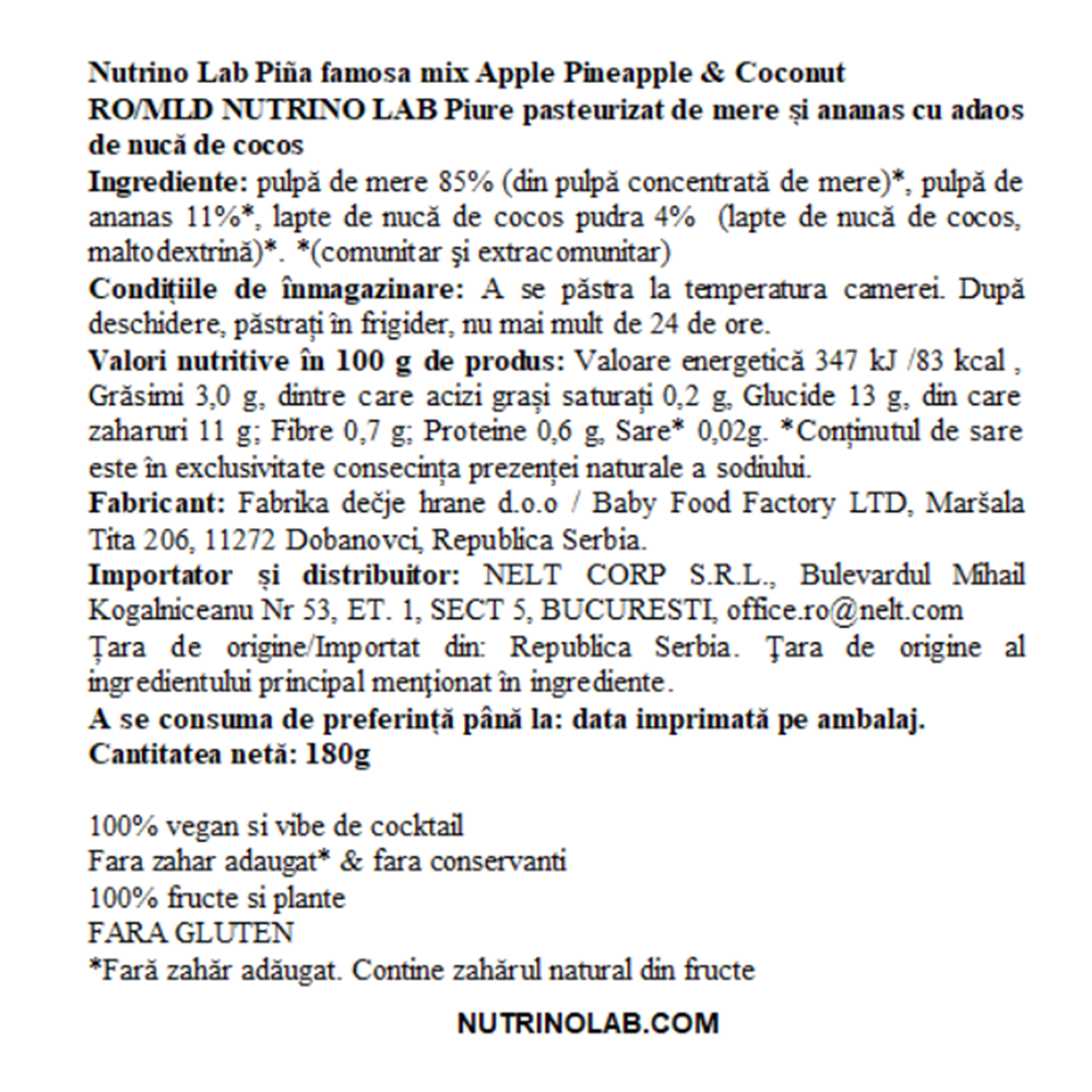 Ingrediente:Pulpa de mere 85% (din pulpa concentrata de mere), Pulpa de ananas 11%, Lapte de nuca de cocos pudra 4% (lapte de nuca de cocos, maltodextrina).