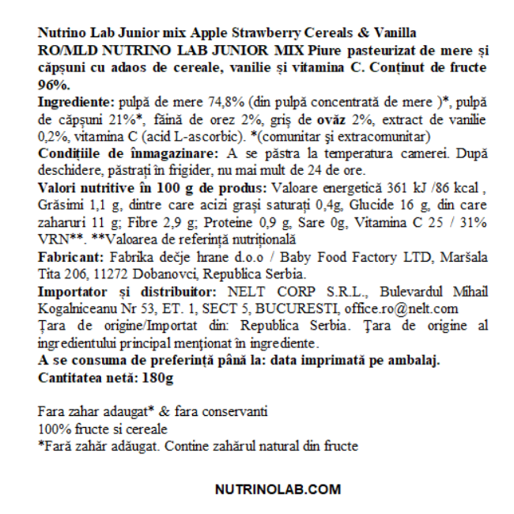 Piure pasteurizat cu mere, capsuni, adaos de cereale, vanilie si vitamina C Junior Mix, 180 g, Nutrino Lab
