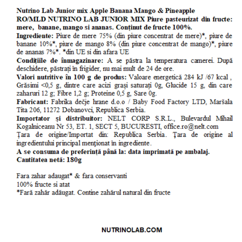 Piure pasteurizat din fructe cu mere, banane, mango si ananas Junior Mix, 180 g, Nutrino Lab