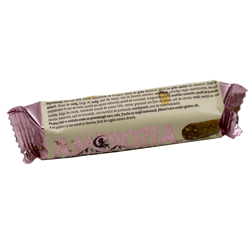 Ingrediente:Biscuiti 50% (Must Concentrat De Struguri, Faina De Grau Dietetica, Faina De Grau Spelta Bio Dietetica, Faina De Secara, Faina De Ovaz, Fulgi De Ovaz, Ulei De Cocos, Ulei De Floarea Soarelui, Semolina, Coacaze Negre Deshidratate, Merisor Deshidratat In Suc De Mere, Pudra De Cacao Naturala, Pasta De Curmale), Magiun De Prune, Arahide Rumenite, Pasta De Arahide, Stafide, Fulgi De Cocos, Ciocolata (Masa De Cacao 72%, Nectar Granulat Din Flori De Cocos, Unt De Cacao), Nuca, Esenta De Rom Identic Naturala, Apa De Trandafir, Ulei Esential De Portocale, Scortisoara, Sare De Mare Neiodata.