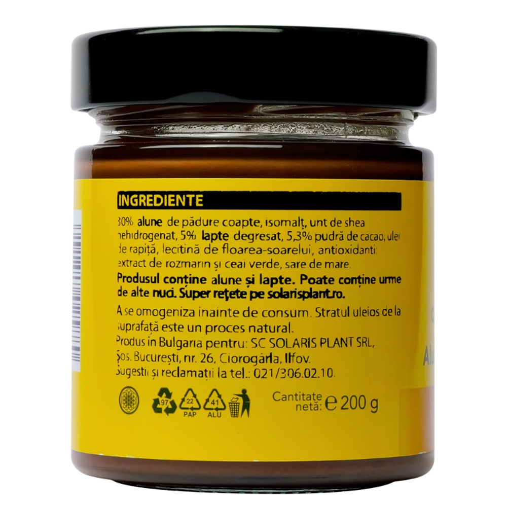 Ingrediente:30% alune de padure coapte, isomalt, unt de shea nehidrogenat, 5% lapte degresat, 5,3% pudra de cacao, ulei de rapita, lecitina de floarea-soarelui, antioxidanti: extract de rozmarin si ceai verde, sare de mare.
