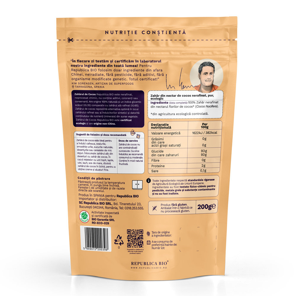- zaharul de cocos Republica BIO este un indulcitor natural, nerafinat si neprocesat chimic, ideal pentru preparate sanatoase si diete echilibrate;