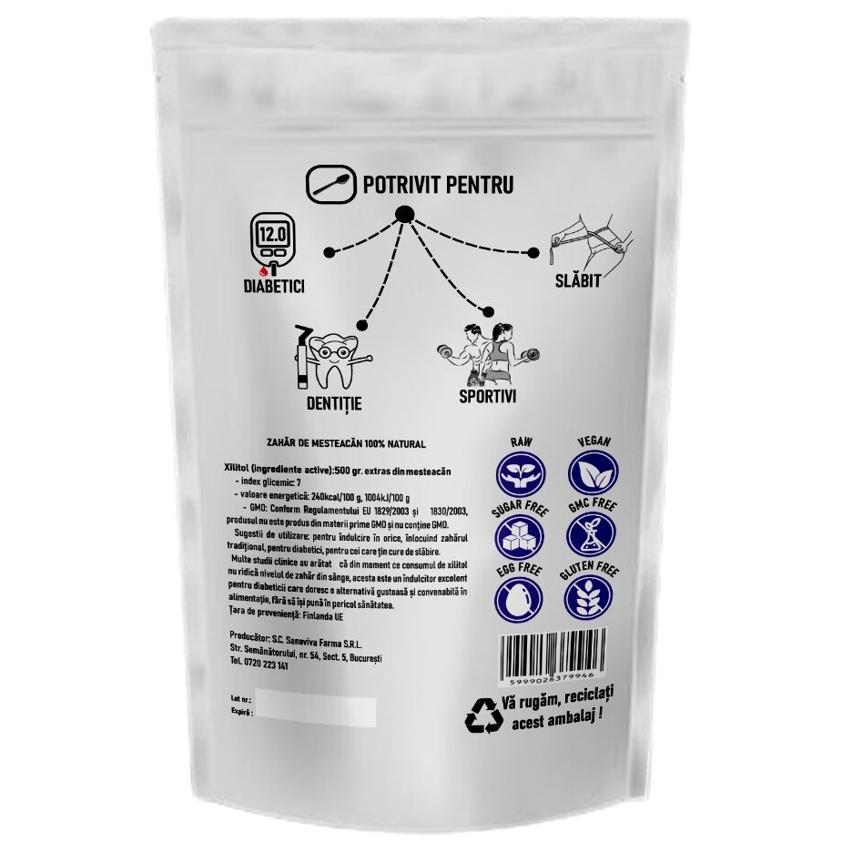 Ingrediente:Xilitol (ingrediente active): 1000 gr. extras din mesteacan.