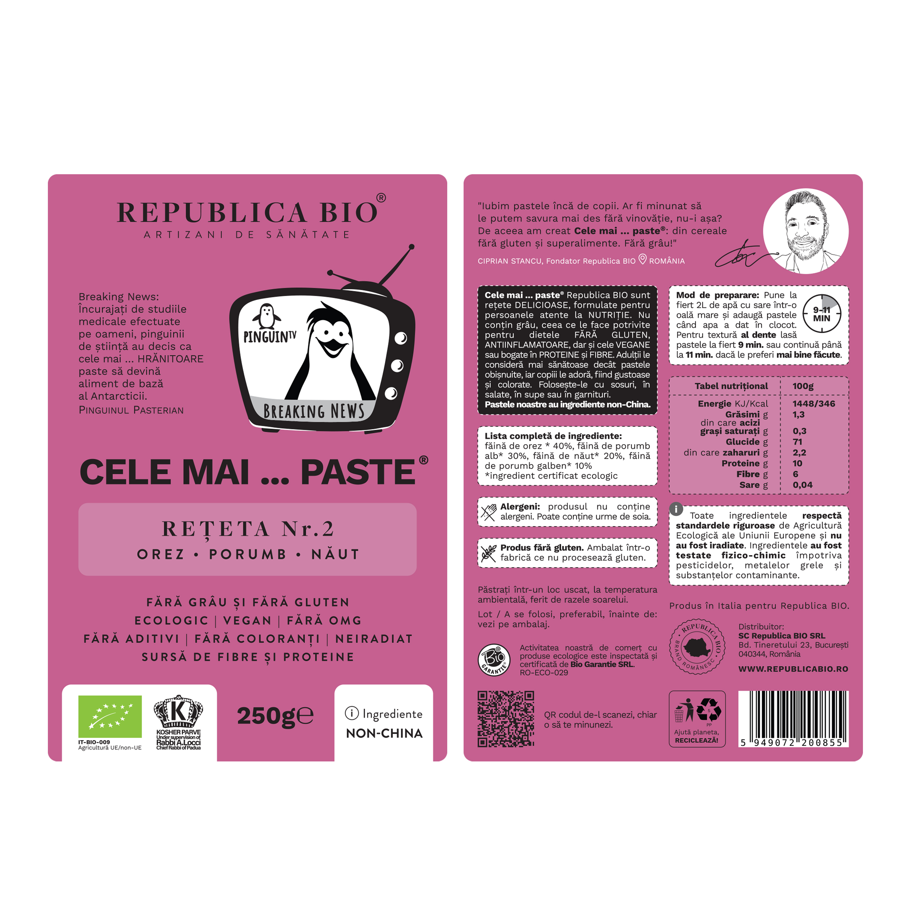 Paste eco, fara gluten, din orez, porumb, naut Reteta nr. 2, 250 g, Republica Bio