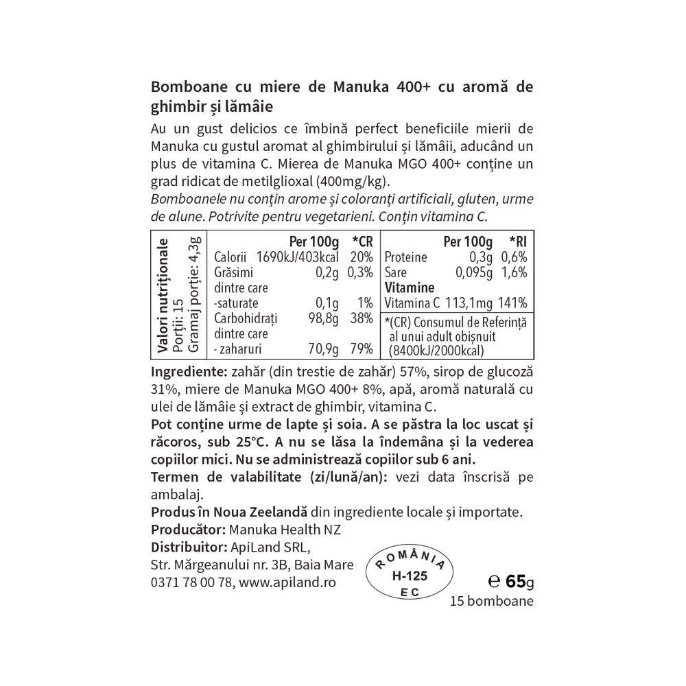Zahar (din trestie de zahar) 57%, sirop de glucoza 31%, miere de Manuka MGO™ 400+ 8%, apa, aroma naturala cu ulei de lamaie si extract de ghimbir, vitamina C.