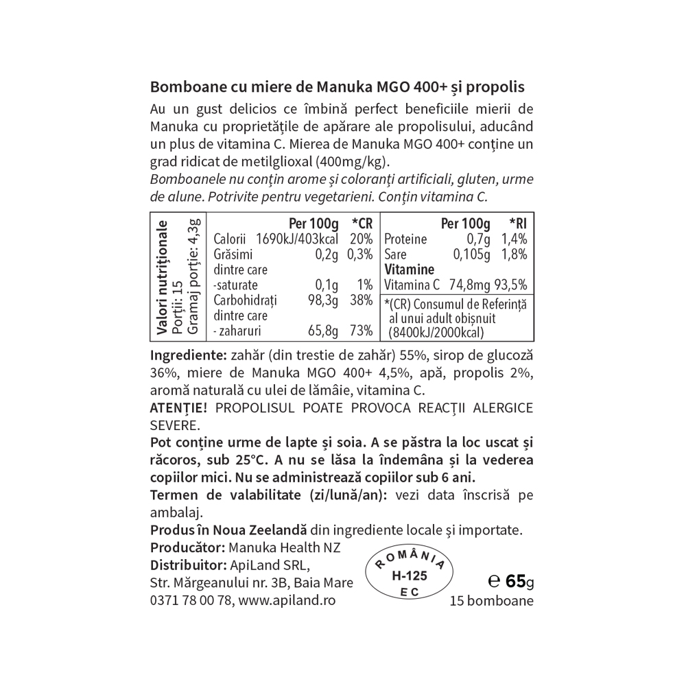 Zahar (din trestie de zahar) 55%, Sirop de Glucoza 36%, Miere de Manuka MGO 400+ 4,5%, Apa, Propolis 2%, Aroma naturala cu ulei de lamaie, Vitamina C.