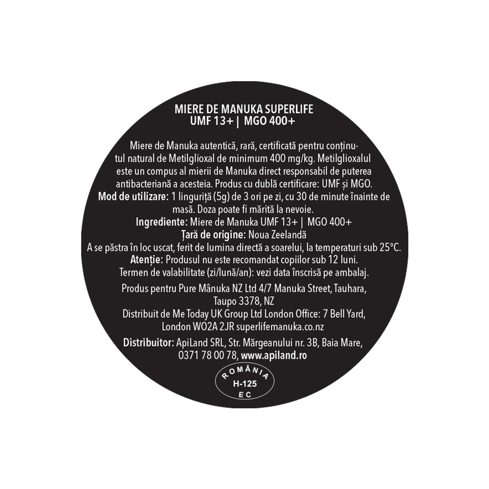 - produsă de albine din nectarul florilor de Manuka, recoltată, testată și certificată cu un conținut de cel puțin 400 mg/kg de metilglioxal, mierea de Manuka SuperLife UMF 13+ | MGO 400+.