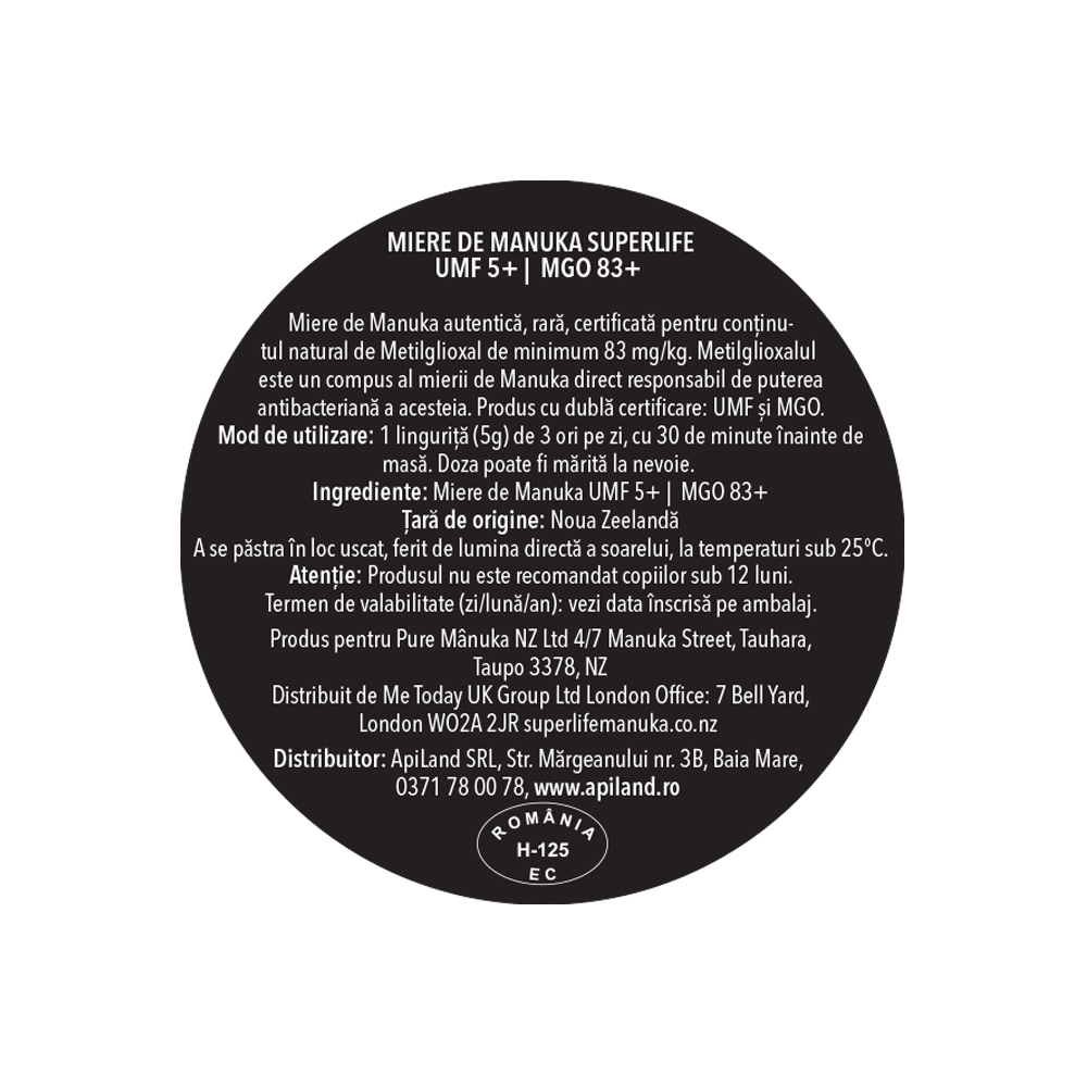 - produsă de albine din nectarul florilor de Manuka, recoltată, testată și certificată cu un conținut de cel puțin 83 mg/kg de metilglioxal, mierea de Manuka SuperLife este aliatul perfect în menținerea unui sistem imunitar puternic.