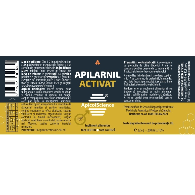 Miere poliflora (bio): 195,97 g; Triturat din larve de trantor (Apilarnil): 18,9 g; Pastura: 4,5 g; Polen poliflor: 4,5 g; extract de Propolis: 0,9 g; uleiuri esentiale de: Portocala-dulce (Citrus sinensis): 0,82 g; Lamaie (Citrus limon): 0,29 g; Musetel (Matricaria chamomilla): 0,01 g.