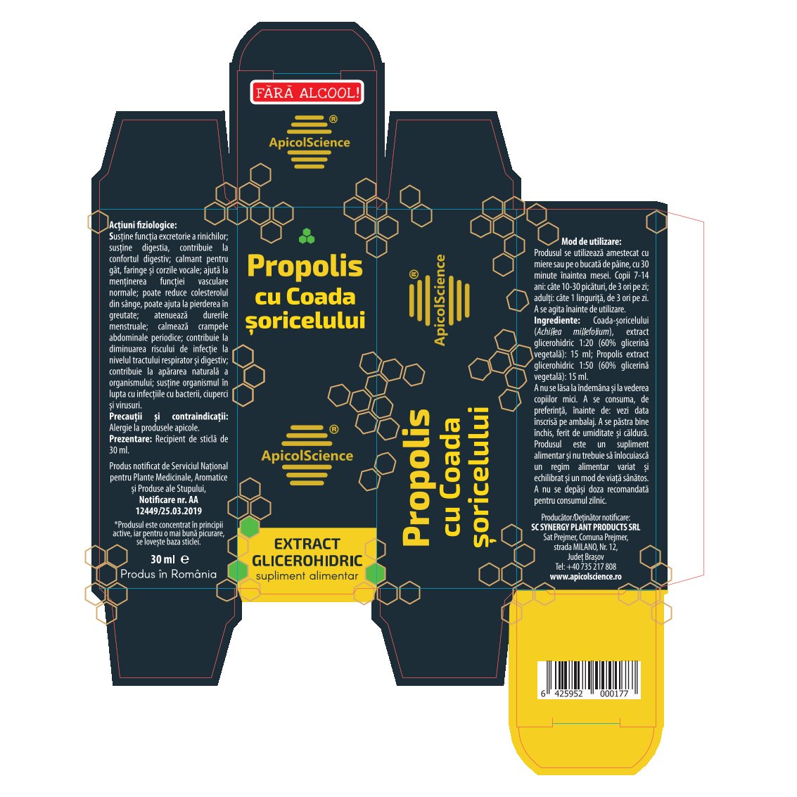Produs notificat de Serviciul National pentru Plante Medicinale, Aromatice si Produse ale Stupului, Notificare nr. AA 12449/25.03.2019.
