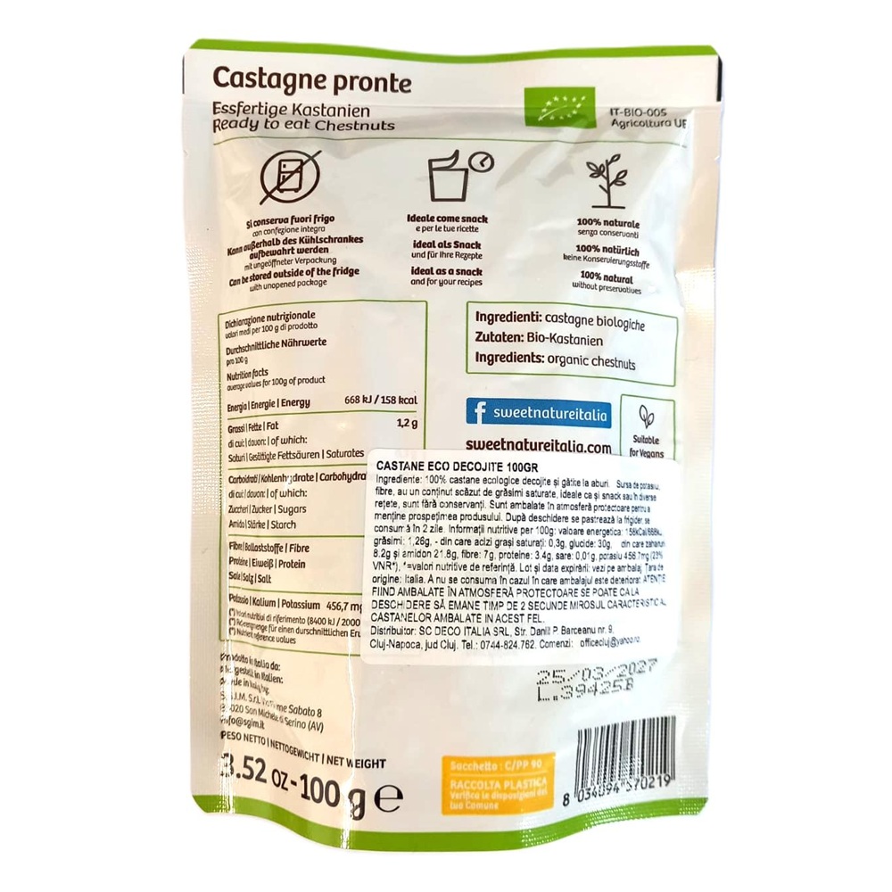 Ingrediente:Castane bio/eco, decojite si gatite la abur, din agricultura ecologica.