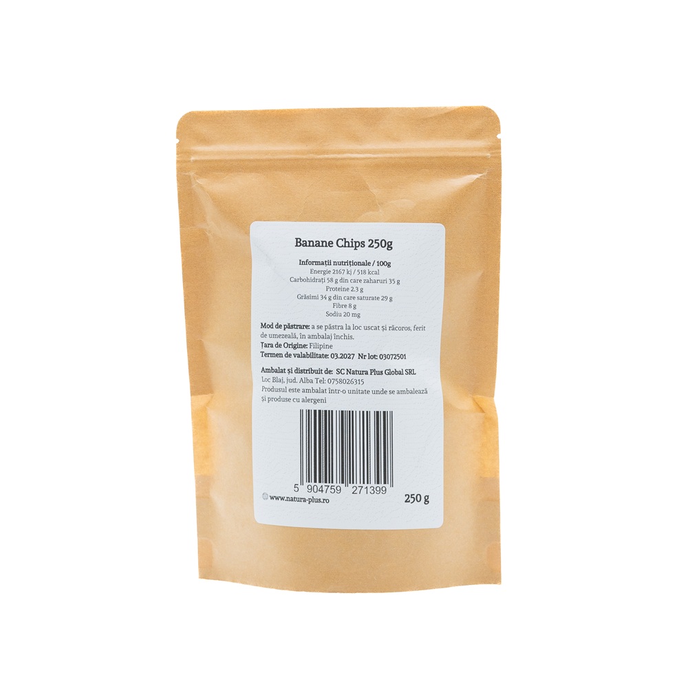 - felii subtiri de banana coapta, deshidratata si prajita usor pentru un gust dulceag si crocant;