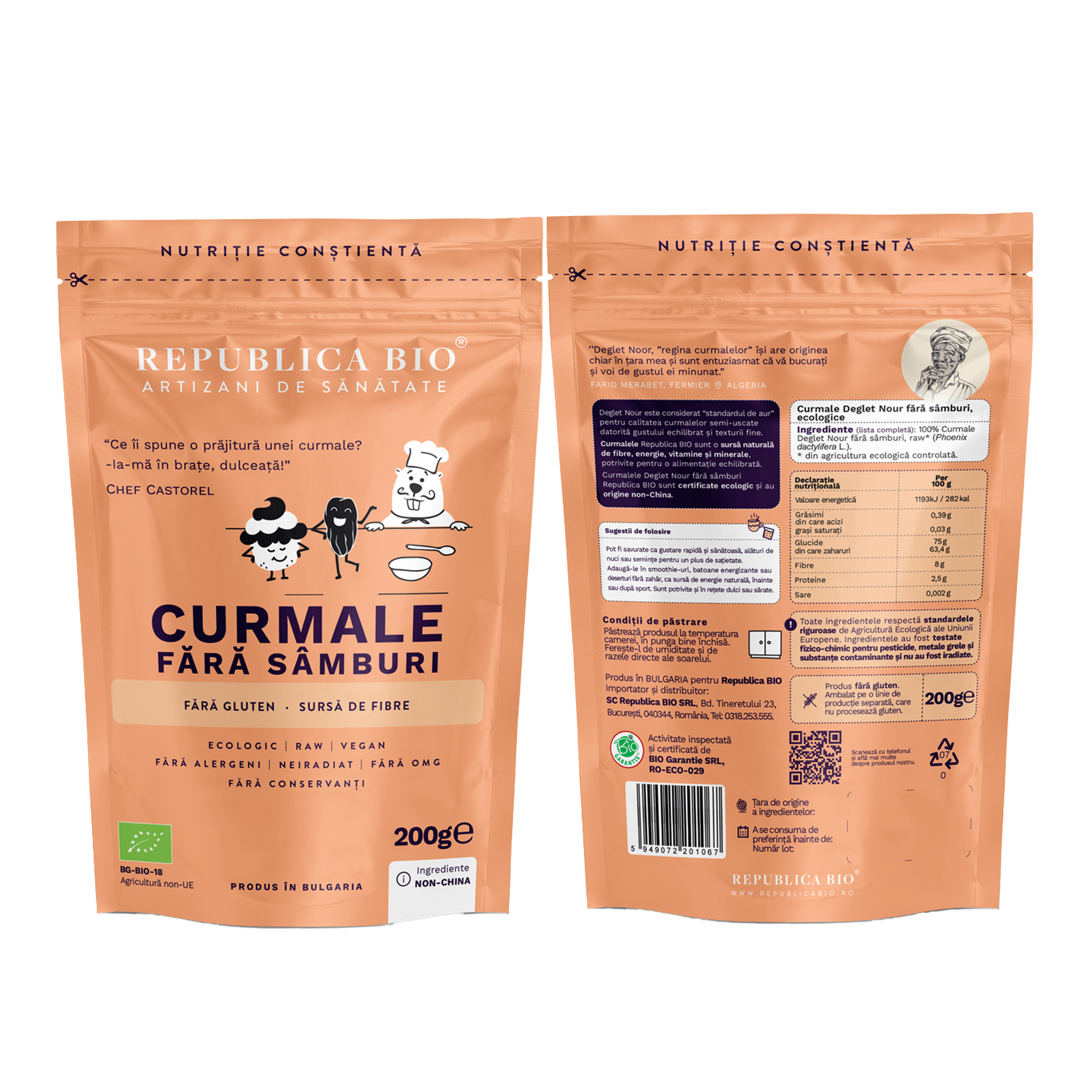 100% Curmale Deglet Nour fara samburi, raw* (Phoenix dactylifera L.). * din agricultura ecologica controlata.