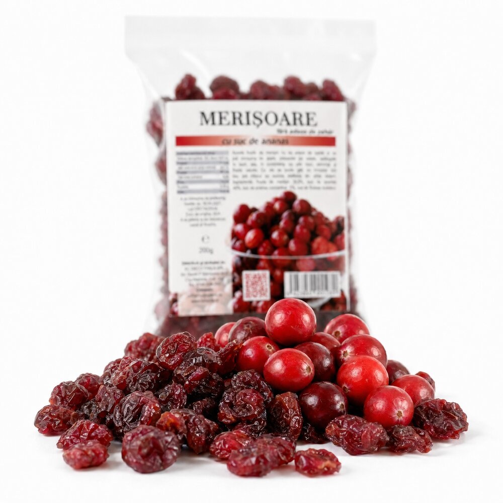 - aceste fructe de merisor nu au adaos de zahar si se pot consuma ca atare, presarate pe salate, adaugate in iaurt, sau in combinatie cu alte nuci, seminte si fructe uscate;