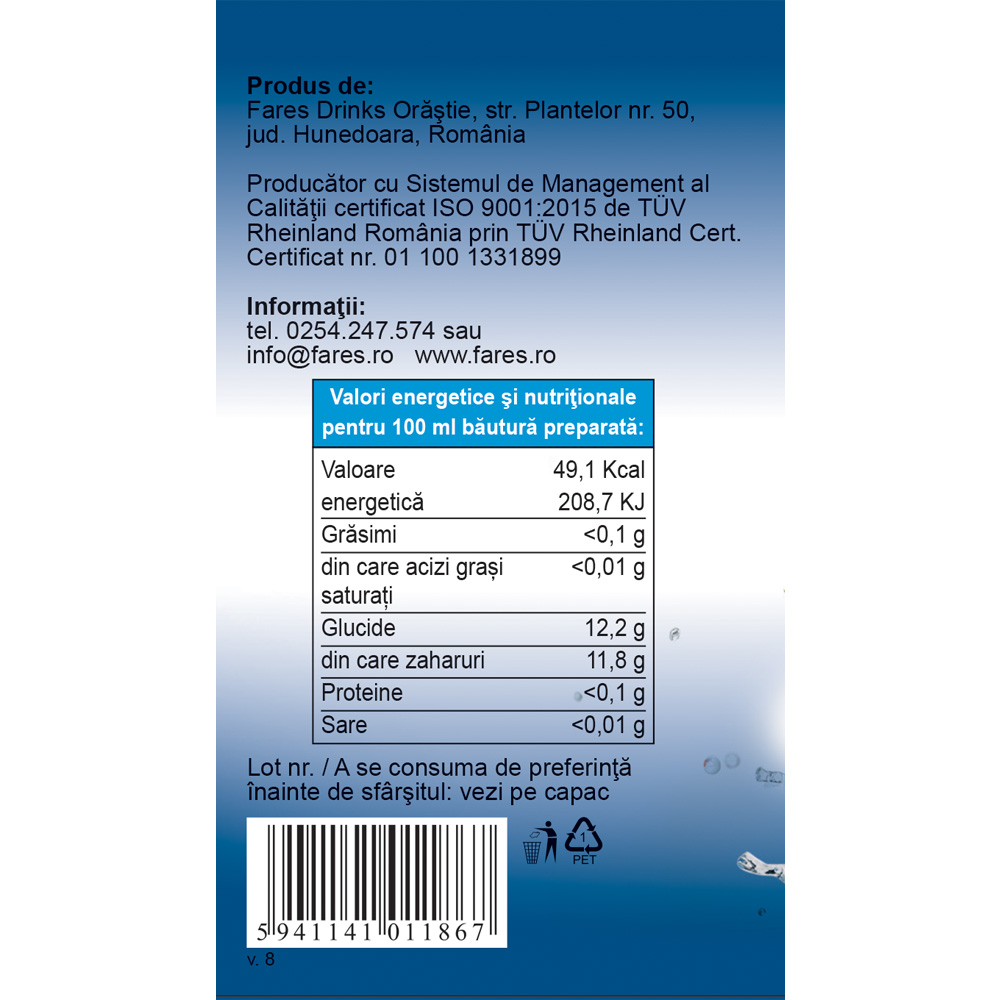 Valori nutritionale:Pentru 100 ml băutură preparată: Valoare 49,1 Kcal energetică 208,7 KJ Grăsimi <0,1 g din care acizi grași <0,01 g saturaţi Glucide 12,2 g B din care zaharuri 11,8 g Proteine <0,1 g Sare <0,01 g.